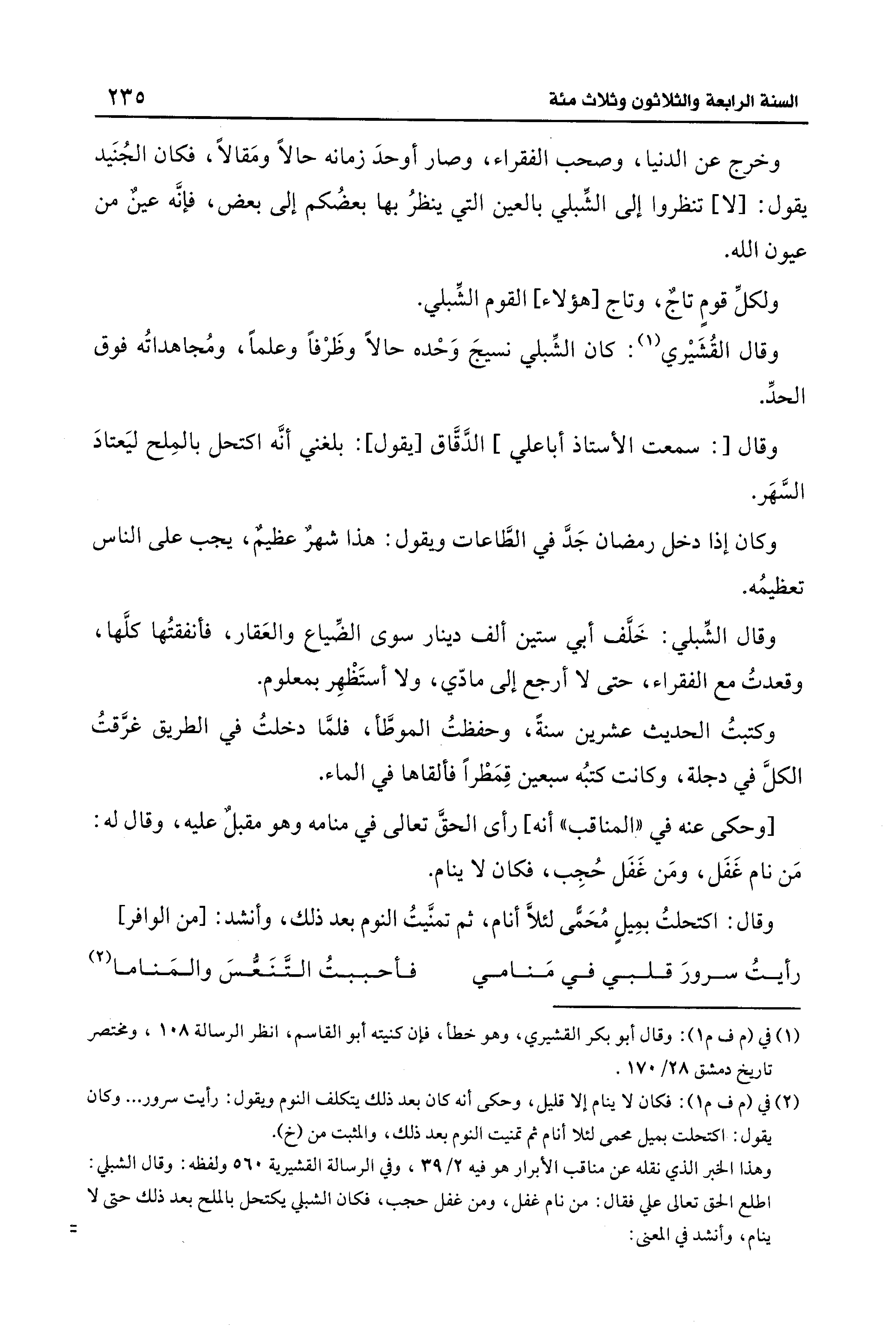 وهذا الخبر الذي نقله عن مناقب الأبرار هو فيه 2/ 39، وفي الرسالة القشيرية 560 ولفظه: وقال الشبلي: اطلع الحق تعالى علي فقال: من نام غفل، ومن غفل حجب، فكان الشبلي يكتحل بالملح بعد ذلك حتى لا وأنشد في المعنى: =