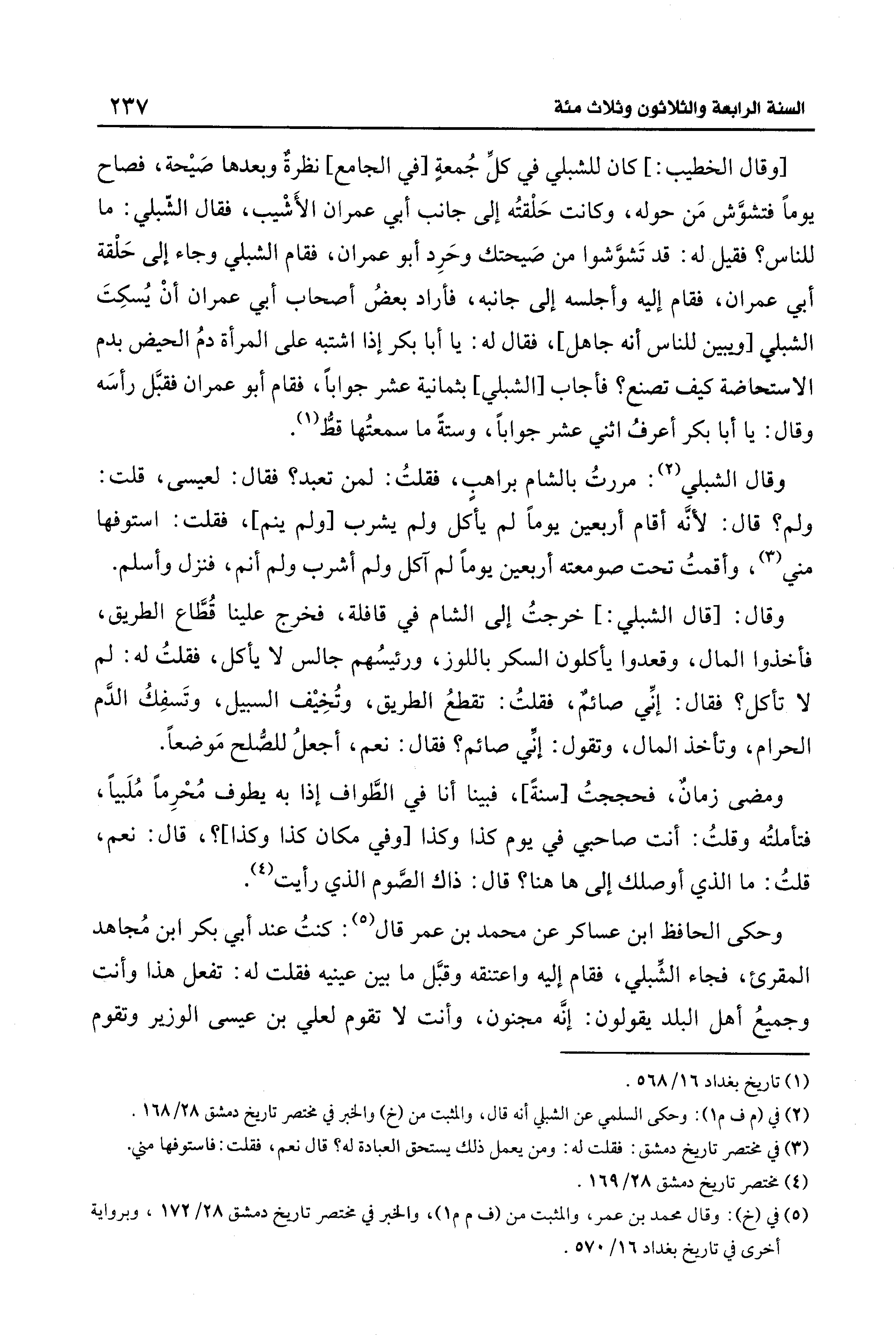[وقال الخطيب: ] كان للشبلي في كلِّ جُمعةٍ [في الجامع] نظرةٌ وبعدها صَيحة، فصاح يومًا فتشوَّش مَن حوله، وكانت حَلْقتُه إلى جانب أبي عمران الأَشْيب، فقال الشّبلي: ما للناس؟ فقيل له: قد تَشوَّشوا من صَيحتك وحَرِد أبو عمران، فقام الشبلي وجاء إلى حَلْقة أبي عمران، فقام إليه وأجلسه إلى جانبه، فأراد بعضُ أصحاب أبي عمران أنْ يُسكِتَ الشبلي [ويبين للناس أنه جاهل]، فقال له: يا أبا بكر إذا اشتبه على المرأة دمُ الحيض بدم الاستحاضة كيف تصنع؟ فأجاب [الشبلي] بثمانية عشر جوابًا، فقام أبو عمران فقبَّل رأسَه وقال: يا أبا بكر أعرفُ اثني عشر جوابًا، وستةً ما سمعتُها قطُّ (¬1).