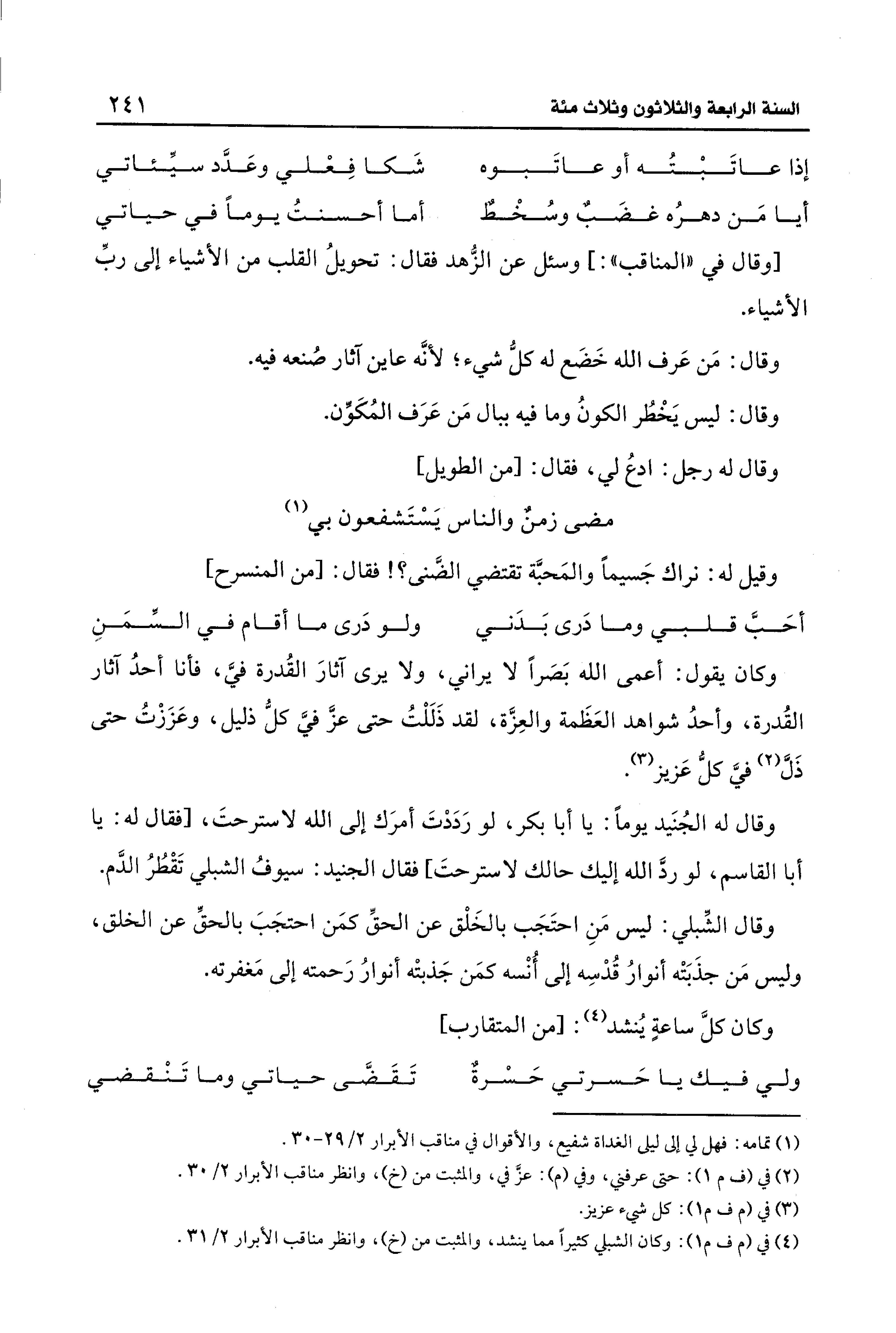 (¬4) في (م ف م 1): وكان الشبلي كثيرًا مما ينشد، والمثبت من (خ)، وانظر مناقب الأبرار 2/ 31.
