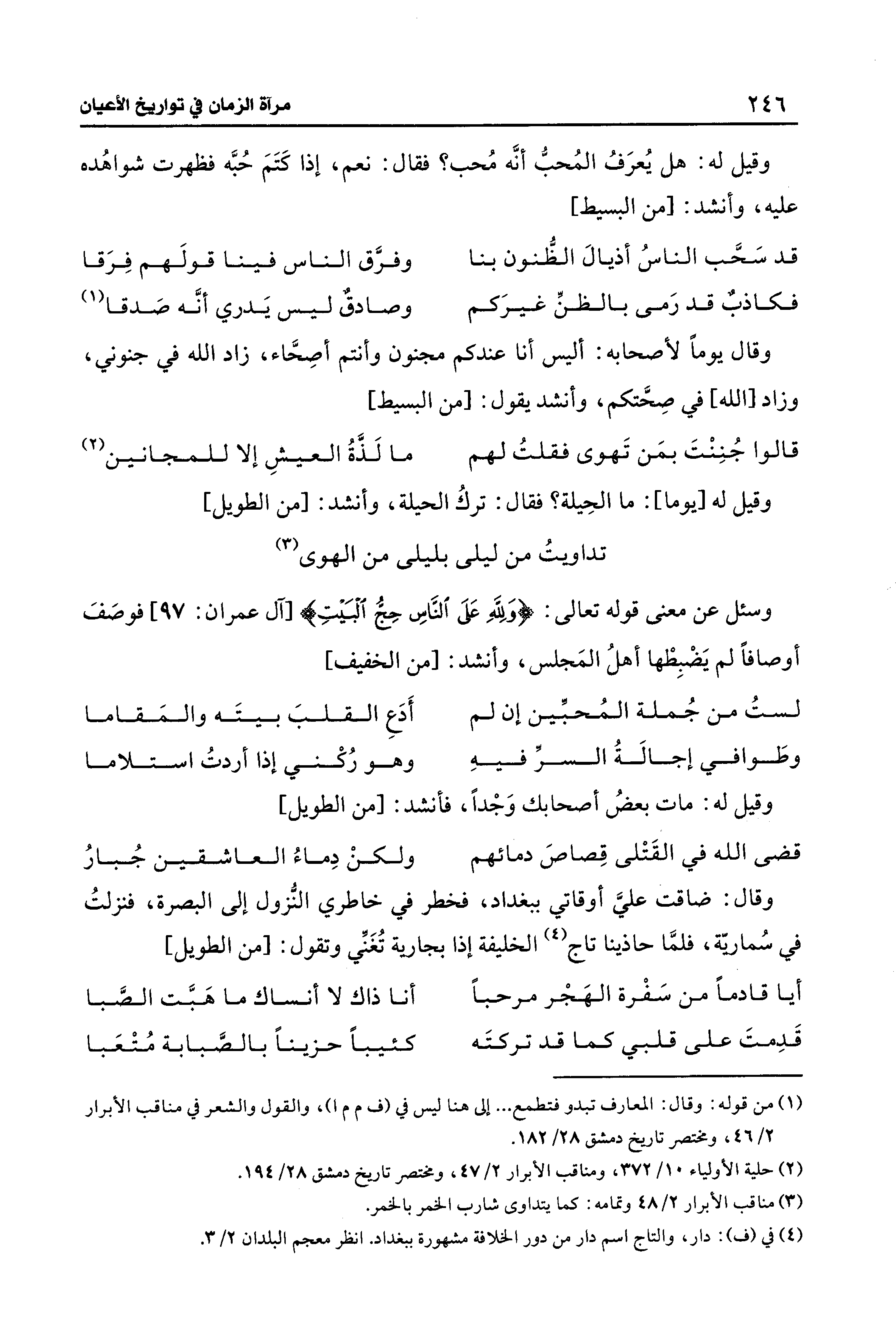 وسئل عن معنى قوله تعالى: {وَلِلَّهِ عَلَى النَّاسِ حِجُّ الْبَيتِ} [آل عمران: 97] فوصَفَ أوصافًا لم يَضْبِطْها أهلُ المَجلس، وأنشد: [من الخفيف]