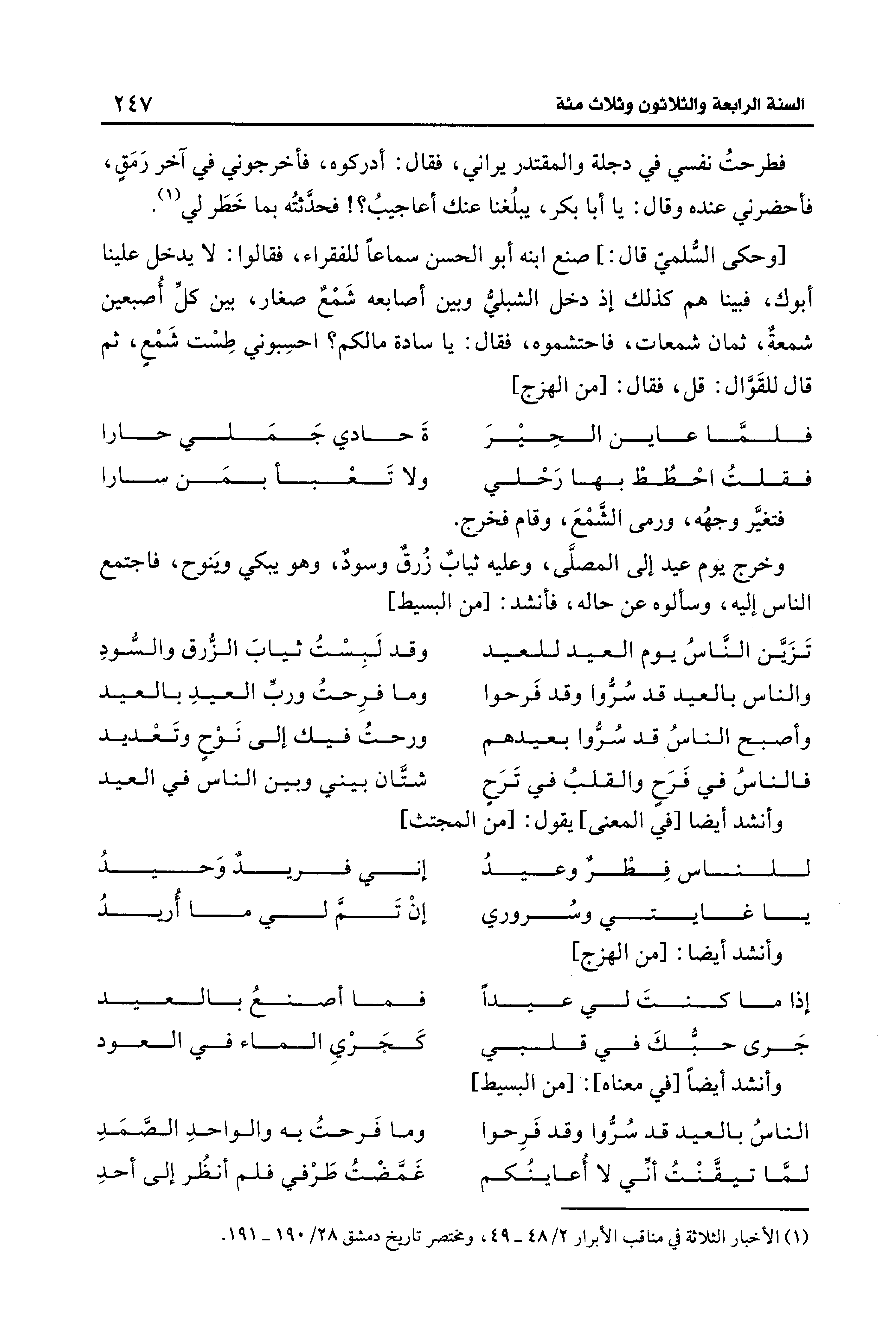 وخرج يوم عيد إلى المصلَّى، وعليه ثيابٌ زُرقٌ وسودٌ، وهو يبكي ويَنوح، فاجتمع الناس إليه، وسألوه عن حاله، فأنشد: [من البسيط]