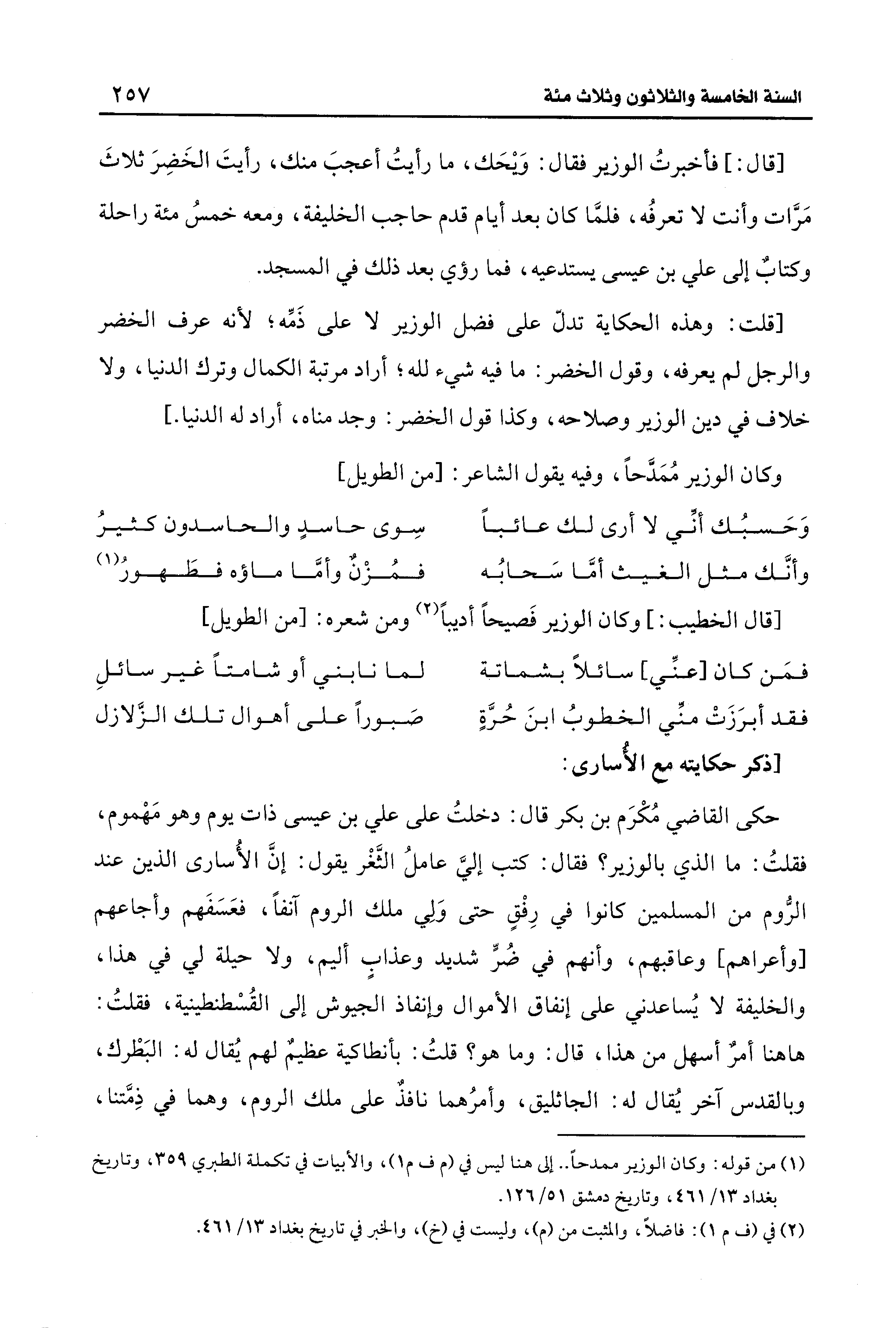 (¬1) من قوله: وكان الوزير ممدحًا .... إلى هنا ليس في (م ف م 1)، والأبيات في تكملة الطبري 359، وتاريخ بغداد 13/ 461، وتاريخ دمشق 51/ 126.