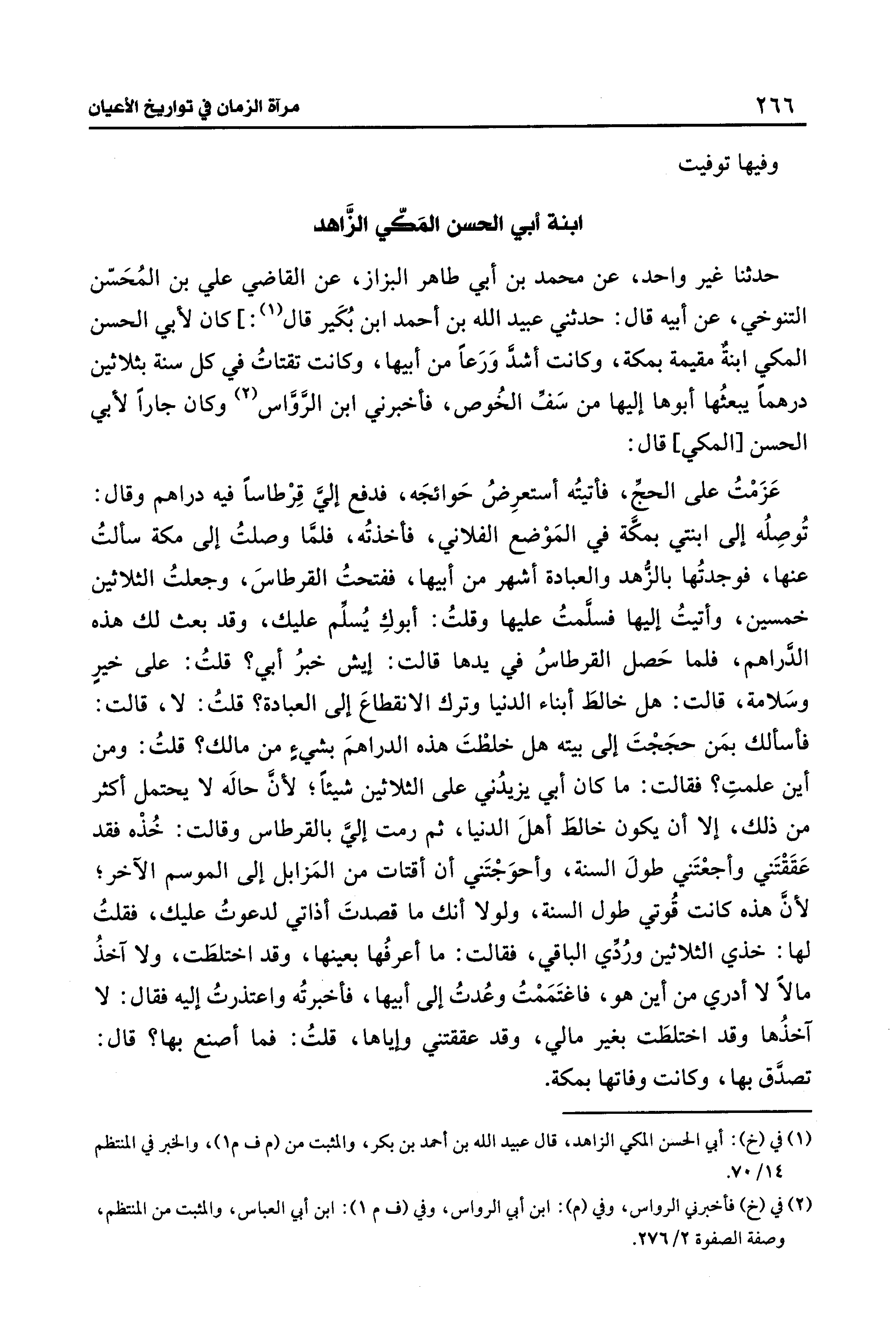 حدثنا غير واحد، عن محمد بن أبي طاهر البزاز، عن القاضي علي بن المُحَسّن التنوخي، عن أبيه قال: حدثني عبيد الله بن أحمد ابن بُكَير قال (¬1): ] كان لأبي الحسن المكي ابنةٌ مقيمة بمكة، وكانت أشدَّ وَرَعًا من أبيها، وكانت تقتاتُ في كل سنة بثلاثين درهمًا يبعثُها أبوها إليها من سَفِّ الخُوص، فأخبرني ابن الرَّوَّاس (¬2) وكان جارًا لأبي الحسن [المكي] قال: عَزَمْتُ على الحجِّ، فأتيتُه أستعرِضُ حَوائجَه، فدفع إليَّ قِرْطاسًا فيه دراهم وقال: تُوصِلُه إلى ابنتي بمكَّة في المَوْضع الفلاني، فأخذتُه، فلمَّا وصلتُ إلى مكة سألتُ عنها، فوجدتُها بالزُّهد والعبادة أشهر من أبيها، ففتحتُ القرطاسَ، وجعلتُ الثلاثين خمسين، وأتيتُ إليها فسلَّمتُ عليها وقلتُ: أبوكِ يُسلِّم عليك، وقد بعث لك هذه الدَّراهم، فلما حَصل القرطاسُ في يدها قالت: إيش خبرُ أبي؟ قلتُ: على خيرٍ وسَلامة، قالت: هل خالطَ أبناء الدنيا وترك الانقطاعَ إلى العبادة؟ قلتُ: لا، قالت: فأسألك بمَن حجَجْتَ إلى بيته هل خلطْتَ هذه الدراهمَ بشيءٍ من مالك؟ قلتُ: ومن أين علمتِ؟ فقالت: ما كان أبي يزيدُني على الثلاثين شيئًا؛ لأنَّ حاله لا يحتمل أكثر من ذلك، إلا أن يكون خالطَ أهلَ الدنيا، ثم رمت إليَّ بالقرطاس وقالت: خُذْه فقد عَقَقْتَني وأجعْتَني طولَ السنة، وأحوَجْتَني أن أقتات من المَزابل إلى الموسم الآخر؛ لأنَّ هذه كانت قُوتي طول السنة، ولولا أنك ما قصدتَ أذاتي لدعوتُ عليك، فقلتُ لها: خذي الثلاثين ورُدِّي الباقي، فقالت: ما أعرفُها بعينها، وقد اختلطَت، ولا آخذُ مالًا لا أدري من أين هو، فاغتَمَمْتُ وعُدتُ إلى أبيها، فأخبرتُه واعتذرتُ إليه فقال: لا آخذُها وقد اختلطَت بغير مالي، وقد عققتني وإياها، قلتُ: فما أصنع بها؟ قال: تصدَّق بها، وكانت وفاتها بمكة.