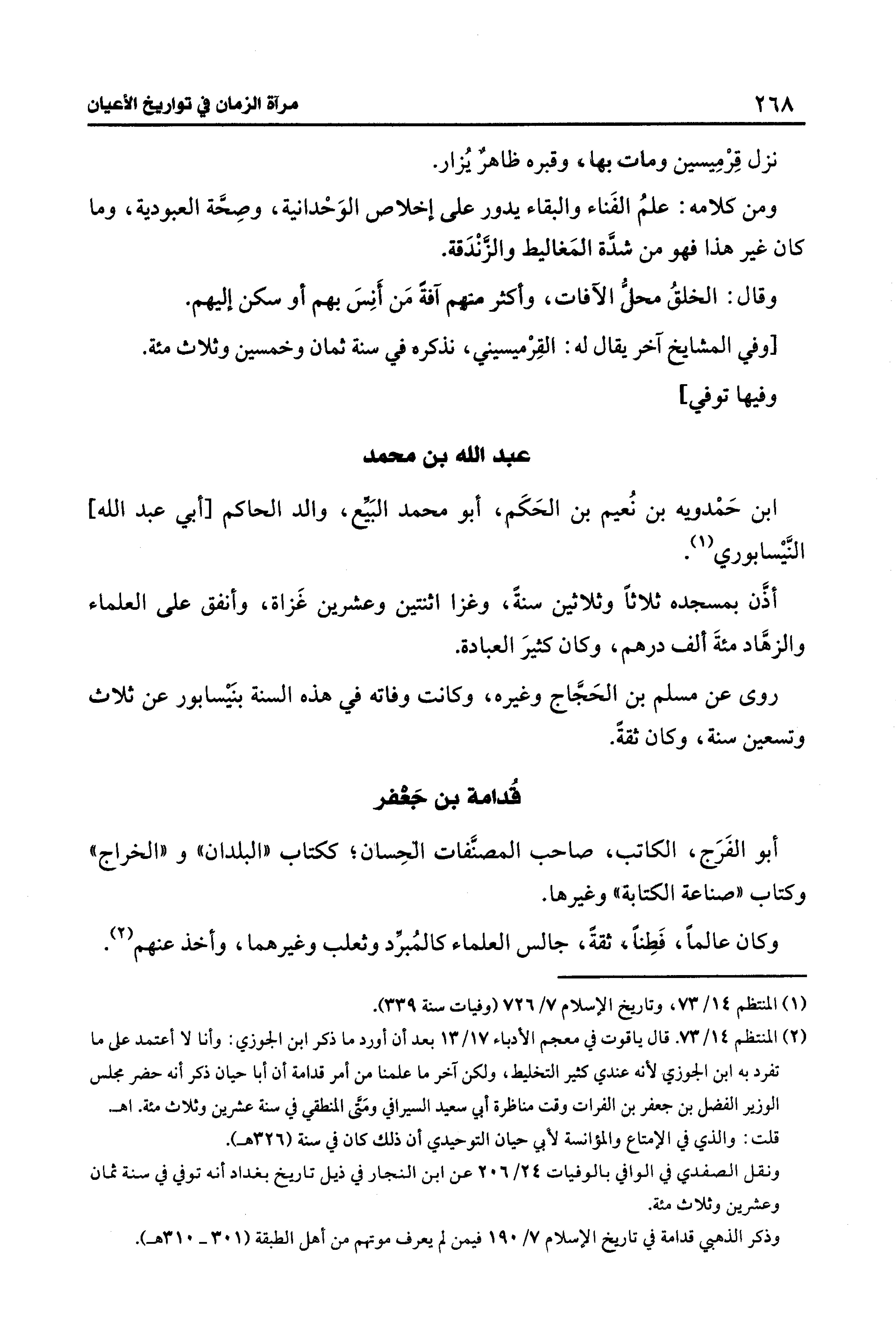 (¬2) المنتظم 14/ 73. قال ياقوت في معجم الأدباء 17/ 13 بعد أن أورد ما ذكر ابن الجوزي: وأنا لا أعتمد على ما تفرد به ابن الجوزي لأنه عندي كثير التخليط، ولكن آخر ما علمنا من أمر قدامة أن أبا حيان ذكر أنَّه حفر مجلس الوزير الفضل بن جعفر بن الفرات وقت مناظرة أبي سعيد السيرافي ومَتَّى المنطقي في سنة عشرين وثلاث مئة. اهـ.