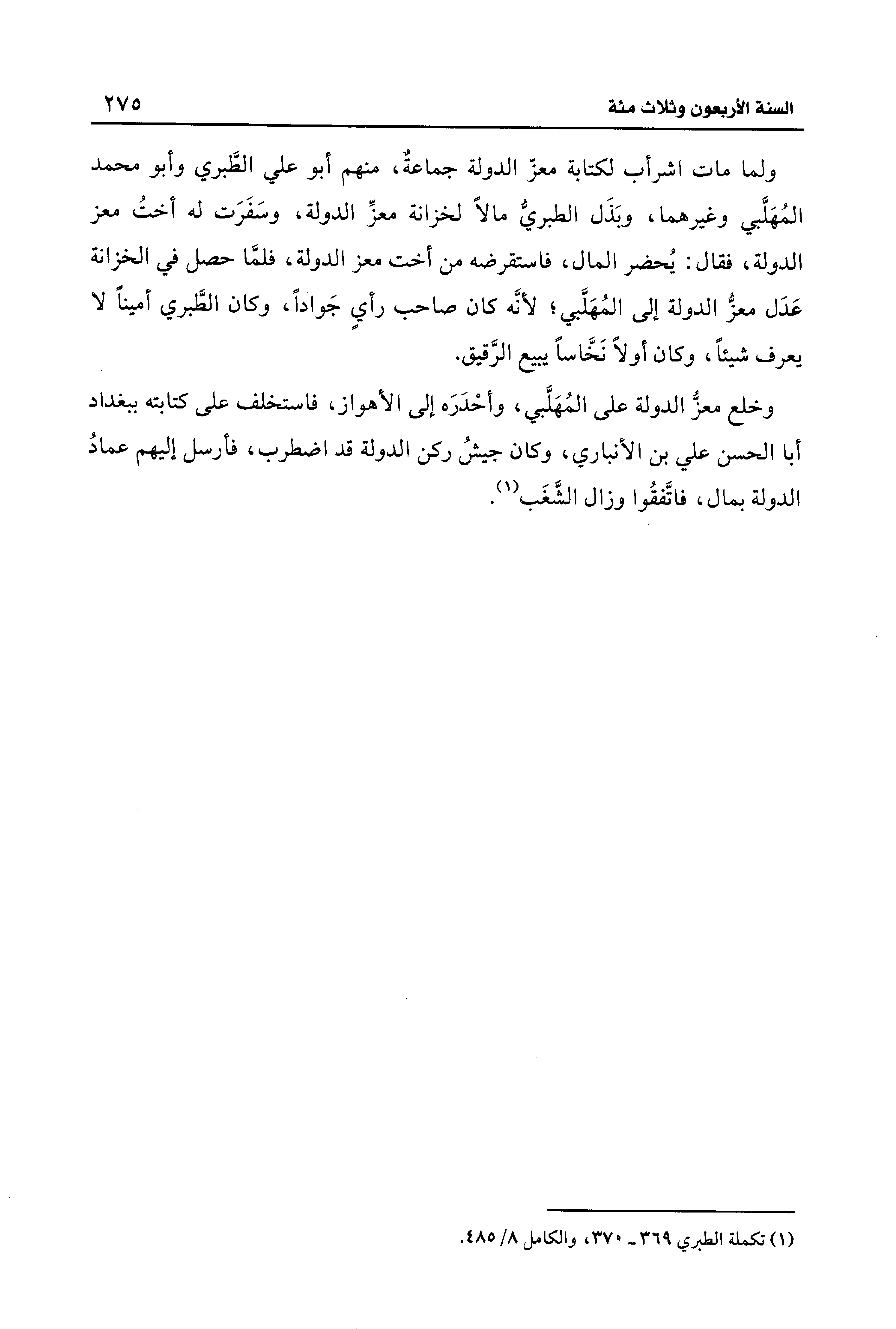 ولما مات اشرأب لكتابة معزّ الدولة جماعةٌ، منهم أبو علي الطَّبري وأبو محمد المُهَلَّبي وغيرهما، وبَذَل الطبريُّ مالًا لخزانة معزِّ الدولة، وسَفَرَت له أختُ معز الدولة، فقال: يُحضر المال، فاستقرضه من أخت معز الدولة، فلمَّا حصل في الخزانة عَدَل معزُّ الدولة إلى المُهَلَّبي؛ لأنَّه كان صاحب رأيٍ جَوادًا، وكان الطَّبري أمينًا لا يعرف شيئًا، وكان أولًا نَخَّاسًا يبيع الرَّقيق.