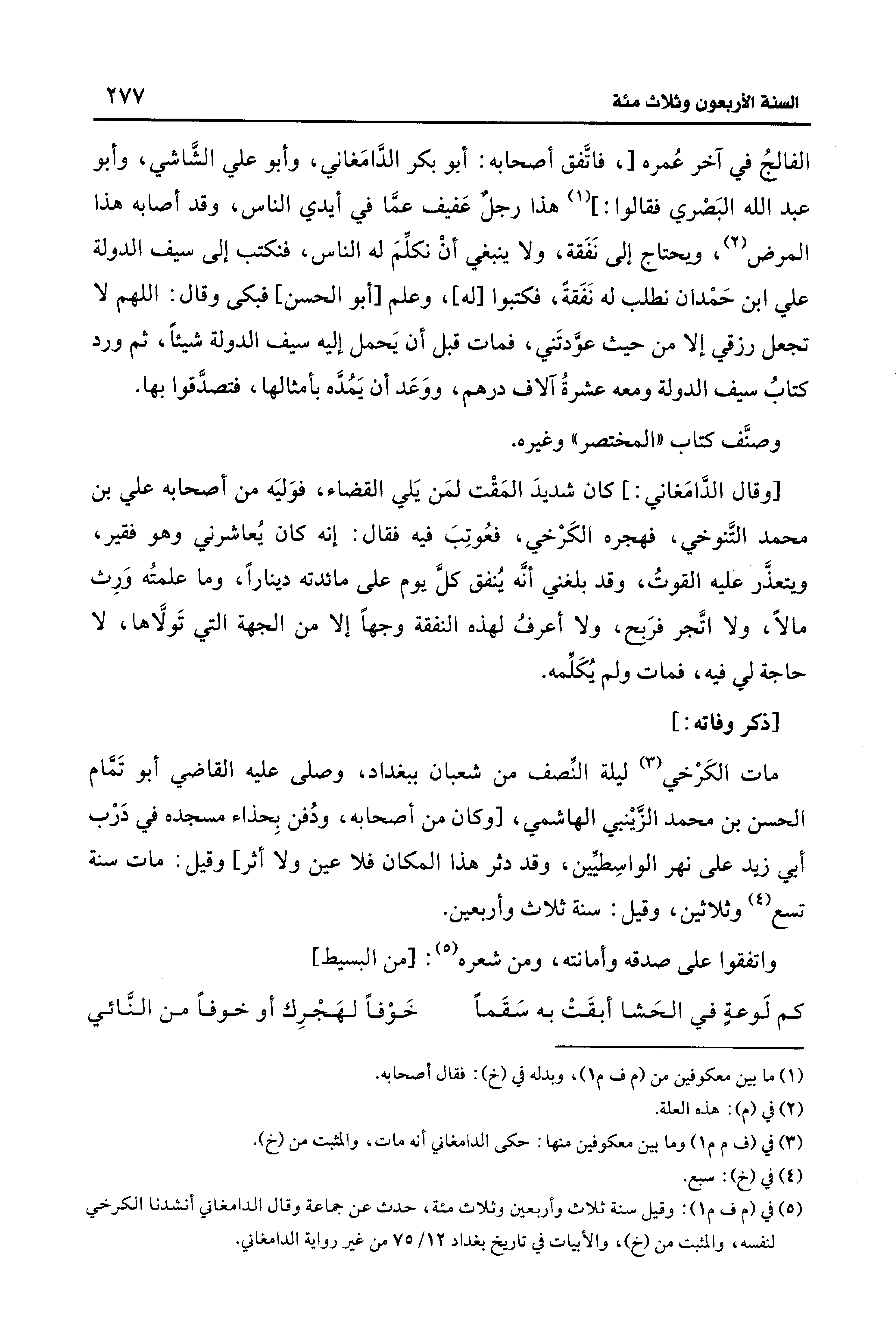 (¬5) في (م ف م 1): وقيل سنة ثلاث وأربعين وثلاث مئة، حدث عن جماعة وقال الدامغاني أنشدنا الكرخي لنفسه، والمثبت من (خ)، والأبيات في تاريخ بغداد 12/ 75 من غير رواية الدامغاني.