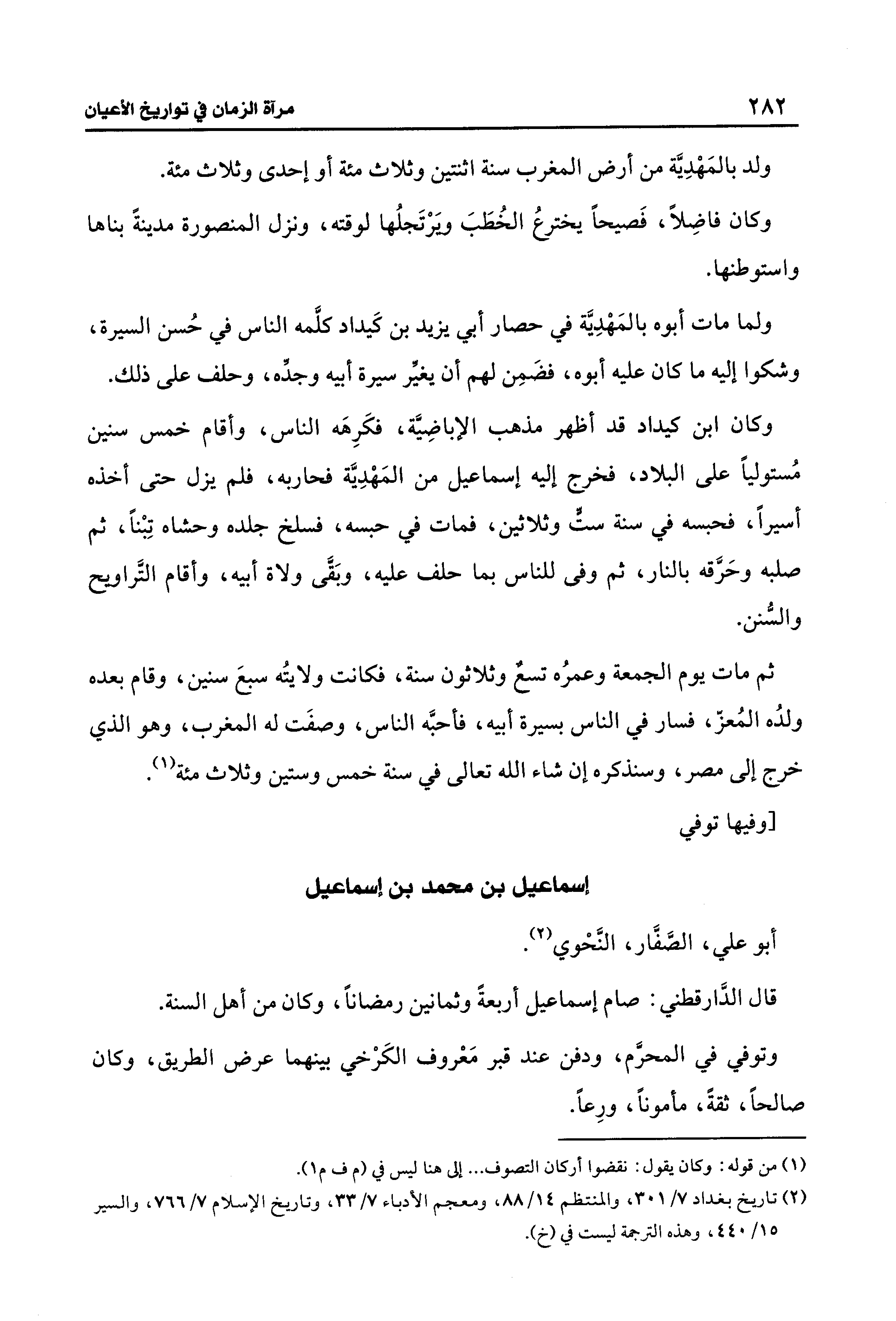 وكان ابن كيداد قد أظهر مذهب الإباضِيَّة، فكَرِهَه الناس، وأقام خمس سنين مُستوليًا على البلاد، فخرج إليه إسماعيل من المَهْدِيَّة فحاربه، فلم يزل حتَّى أخذه أسيرًا، فحبسه في سنة ستٍّ وثلاثين، فمات في حبسه، فسلخ جلده وحشاه تِبْنًا، ثم صلبه وحَرَّقه بالنار، ثم وفي للناس بما حلف عليه، وبَقَّى ولاة أبيه، وأقام التَّراويح والسُّنن.