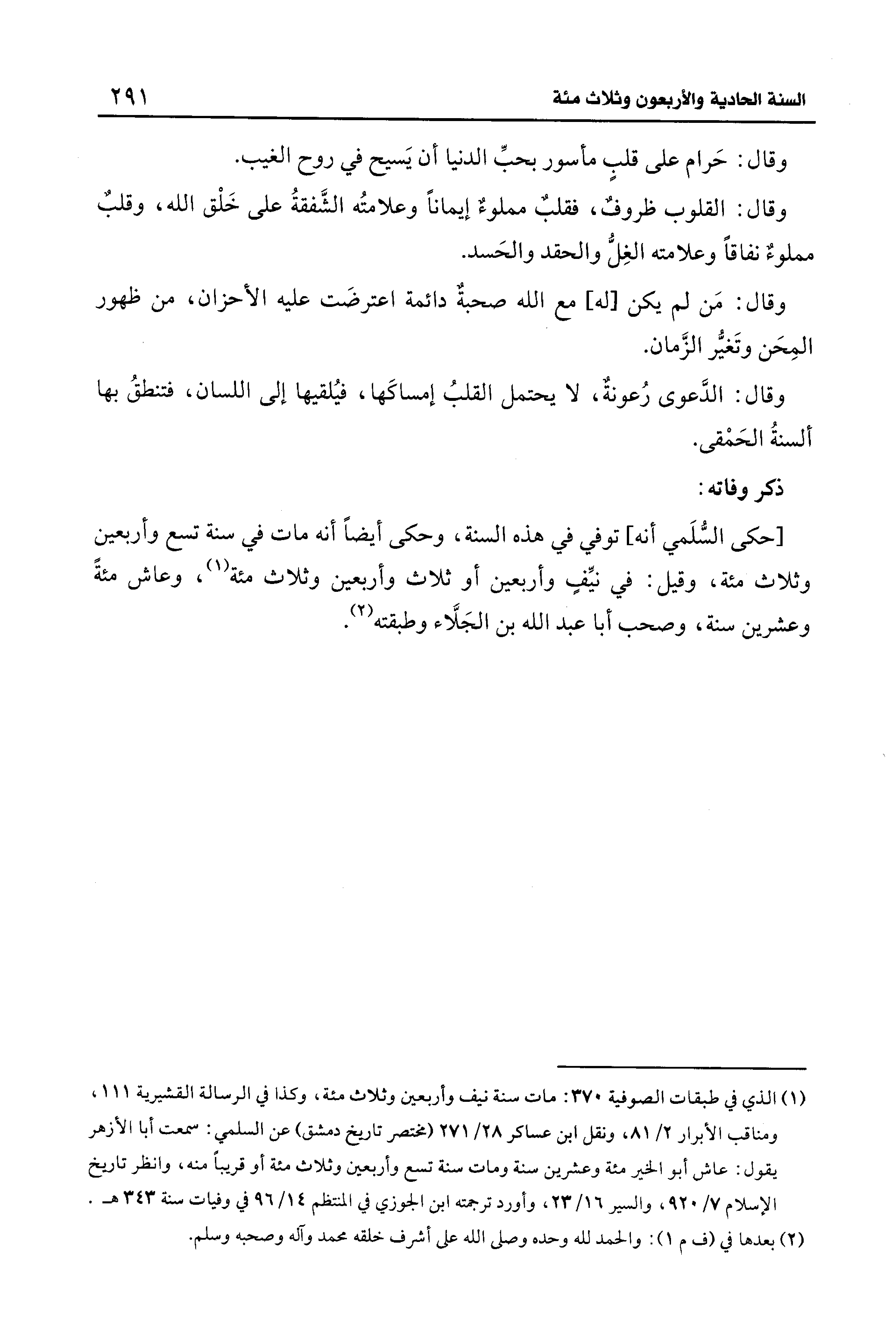 (¬1) الَّذي في طبقات الصوفية 370: مات سنة نيف وأربعين وثلاث مئة، وكذا في الرسالة القشيرية 111، ومناقب الأبرار 2/ 81، ونقل ابن عساكر 28/ 271 (مختصر تاريخ دمشق) عن السلمي: سمعت أبا الأزهر يقول: عاش أبو الخير مئة وعشرين سنة ومات سنة تسع وأربعين وثلاث مئة أو قريبًا منه، وانظر تاريخ الإسلام 7/ 920، والسير 16/ 23، وأورد ترجمته ابن الجوزي في المنتظم 14/ 96 في وفيات سنة 343 هـ.