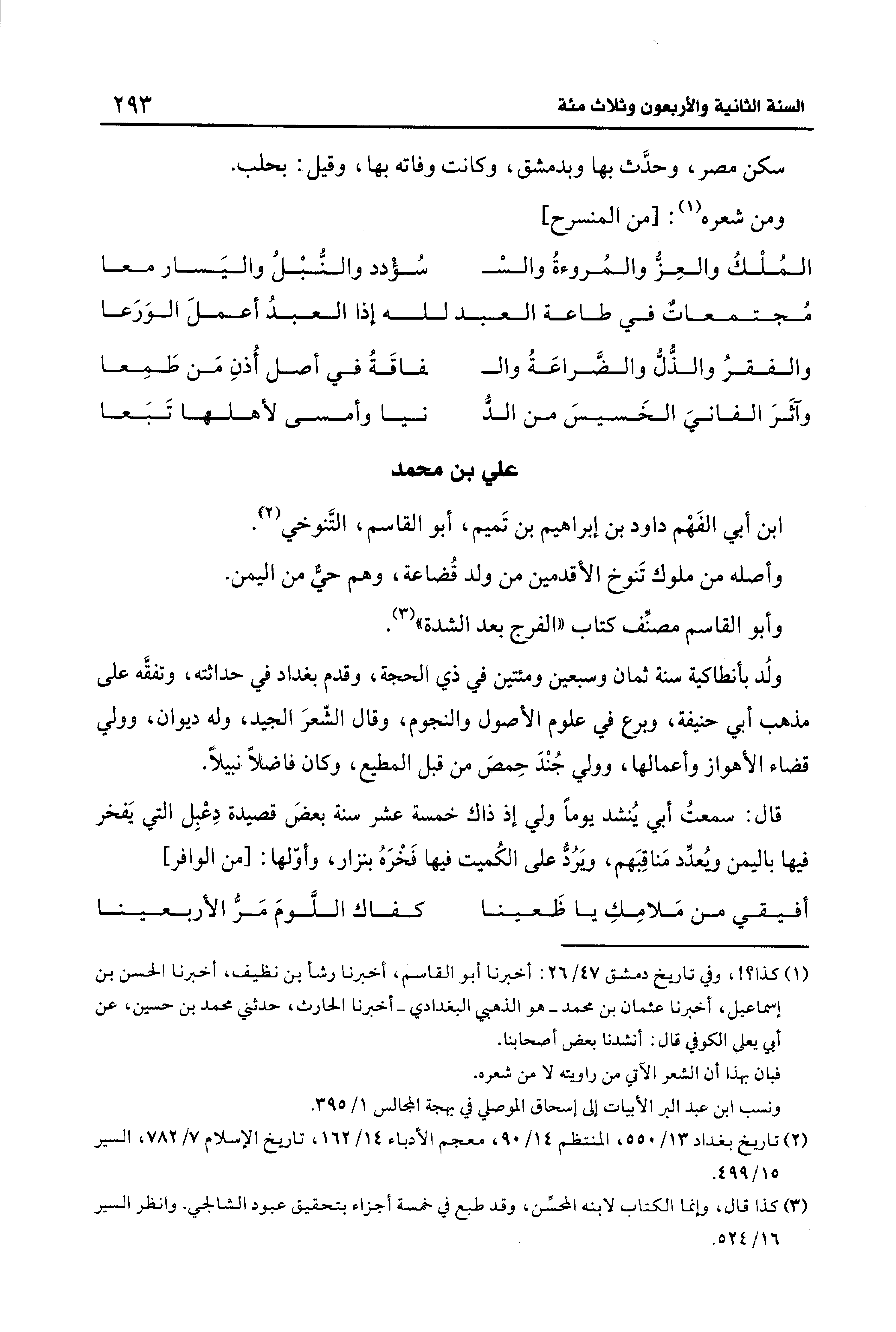 (¬3) كذا قال، وإنما الكتاب لابنه المحسِّن، وقد طبع في خسة أجزاء بتحقيق عبود الشالجي. وانظر السير 16/ 524.