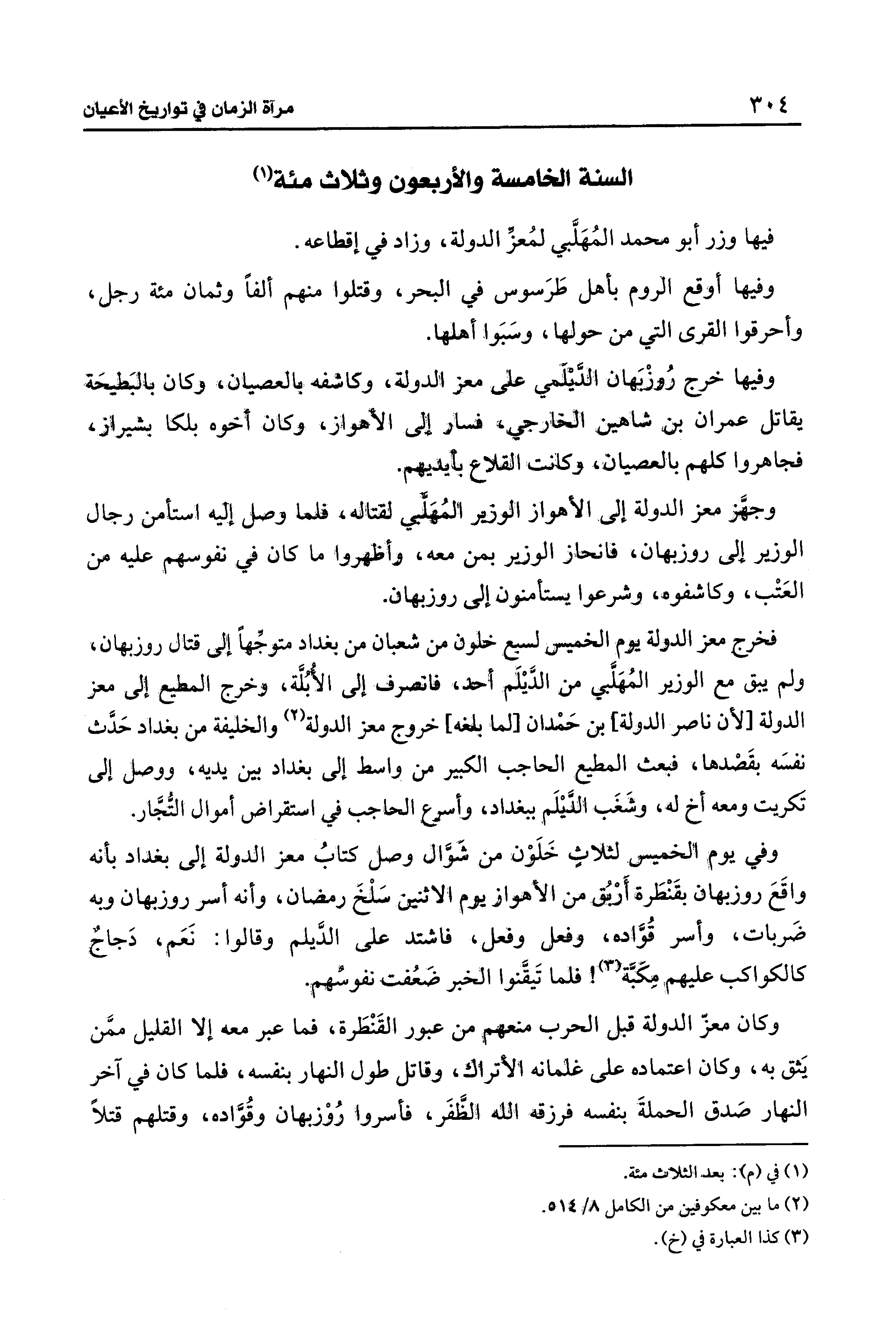 فخرج معز الدولة يوم الخميس لسبع خلون من شعبان من بغداد متوجِّهًا إلى قتال روزبهان، ولم يبق مع الوزير المُهَلَّبي من الدَّيلَم أحد، فانصرف إلى الأُبُلَّة، وخرج المطيع إلى معز الدولة [لأن ناصر الدولة] بن حَمْدان [لما بلغه] خروج معز الدولة (¬2) والخليفة من بغداد حَدَّث نفسَه بقَصْدها، فبعث المطيع الحاجب الكبير من واسط إلى بغداد بين يديه، ووصل إلى تكريت ومعه أخ له، وشَغَب الدَّيْلَم ببغداد، وأسرع الحاجب في استقراض أموال التُّجَّار.