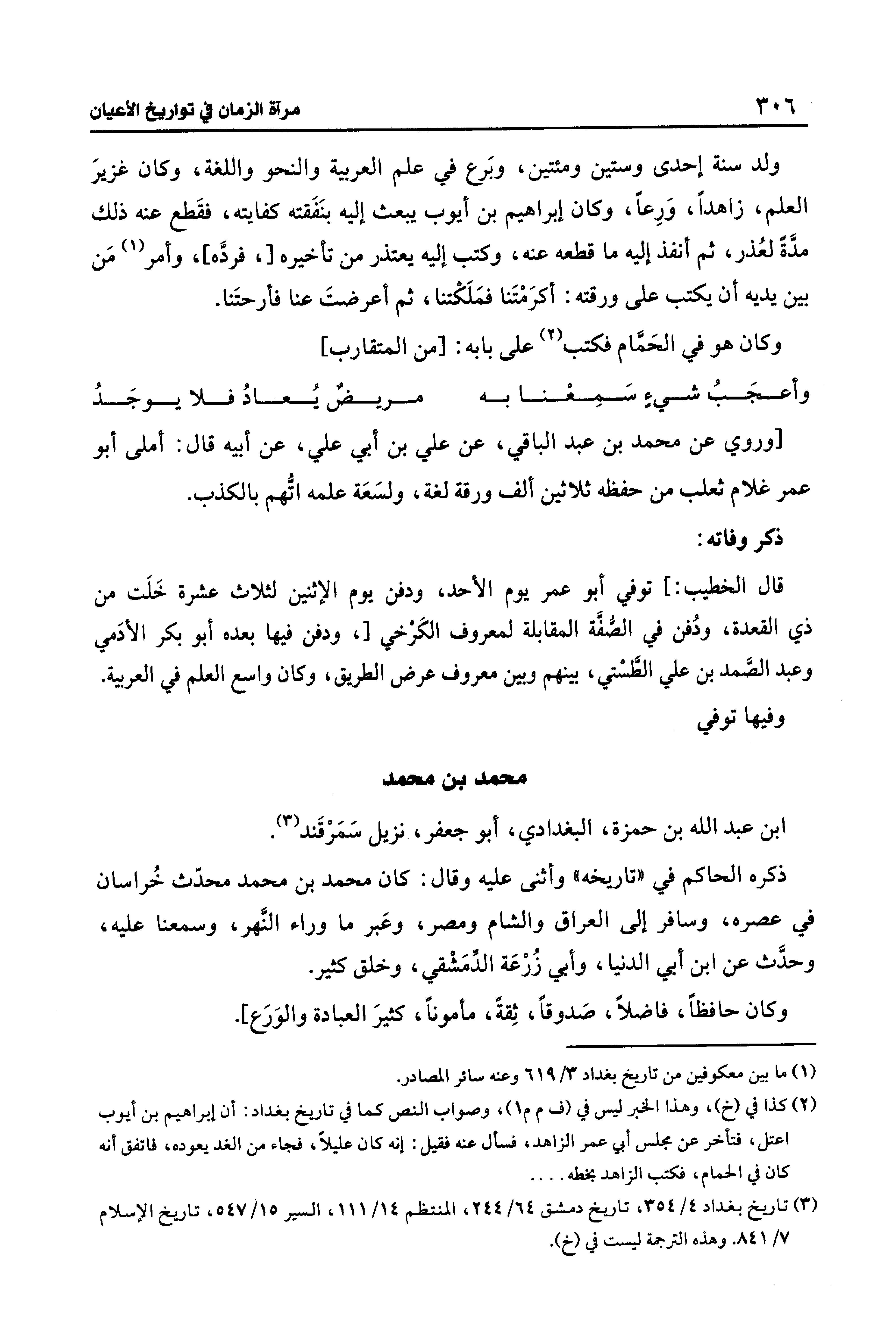 (¬2) كذا في (خ)، وهذا الخبر ليس في (ف م م 1)، وصواب النص كما في تاريخ بغداد: أن إبراهيم بن أيوب اعتل، فتأخر عن مجلس أبي عمر الزاهد، فسأل عنه فقيل: إنه كان عليلًا، فجاء من الغد يعوده، فاتفق أنَّه كان في الحمام، فكتب الزاهد بخطه ....