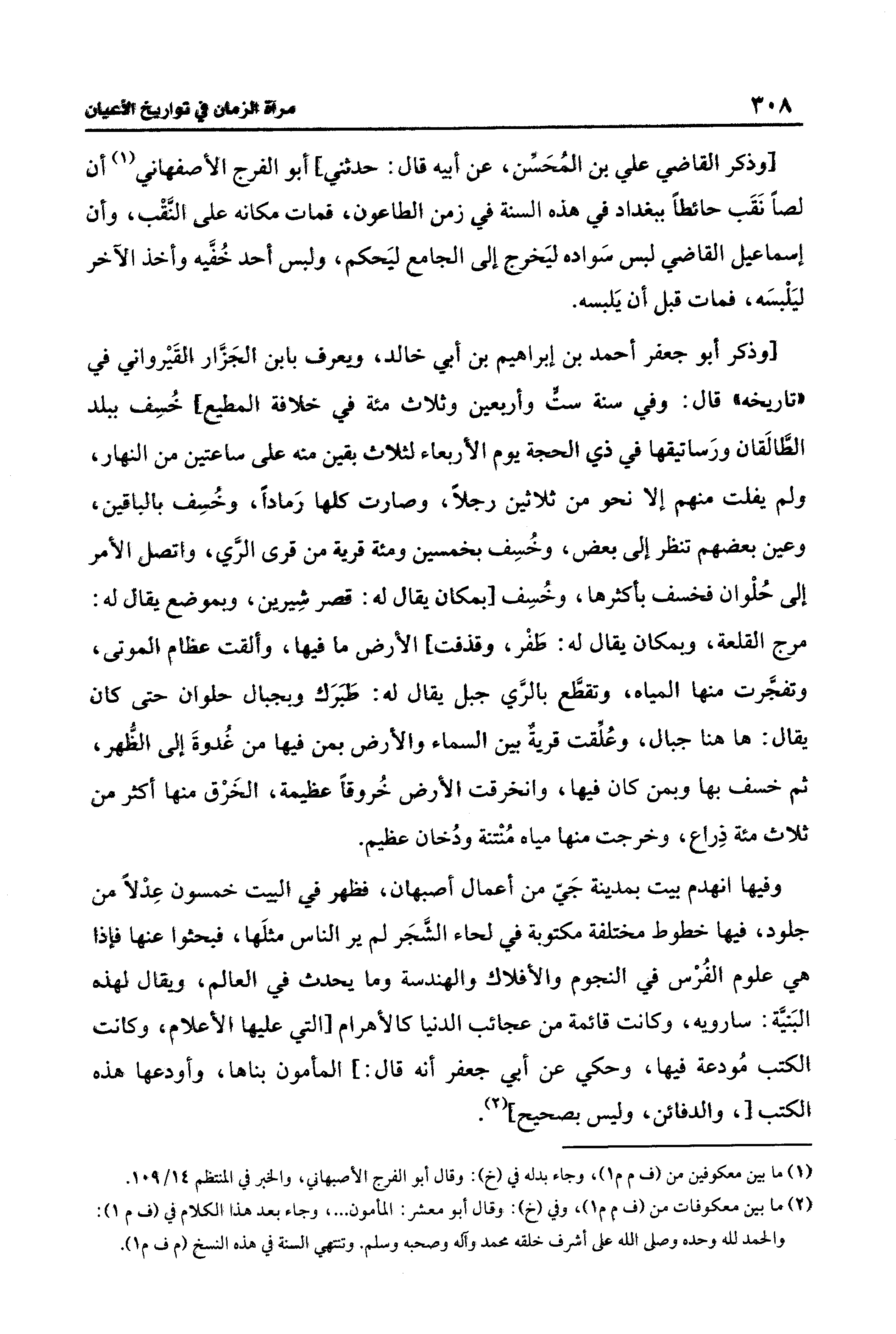 وفيها انهدم بيت بمدينة جَيّ من أعمال أصبهان، فظهر في البيت خمسون عِدْلًا من جلود، فيها خطوط مختلفة مكتوبة في لحاء الشَّجَر لم ير الناس مثلَها، فبحثوا عنها فإذا هي علوم الفُرْس في النجوم والأفلاك والهندسة وما يحدث في العالم، ويقال لهذه البَنيَّة: سارويه، وكانت قائمة من عجائب الدنيا كالأهرام [التي عليها الأعلام، وكانت الكتب مُودعة فيها، وحكي عن أبي جعفر أنَّه قال: ] المأمون بناها، وأودعها هذه الكتب [، والدفائن، وليس بصحيح] (¬2).