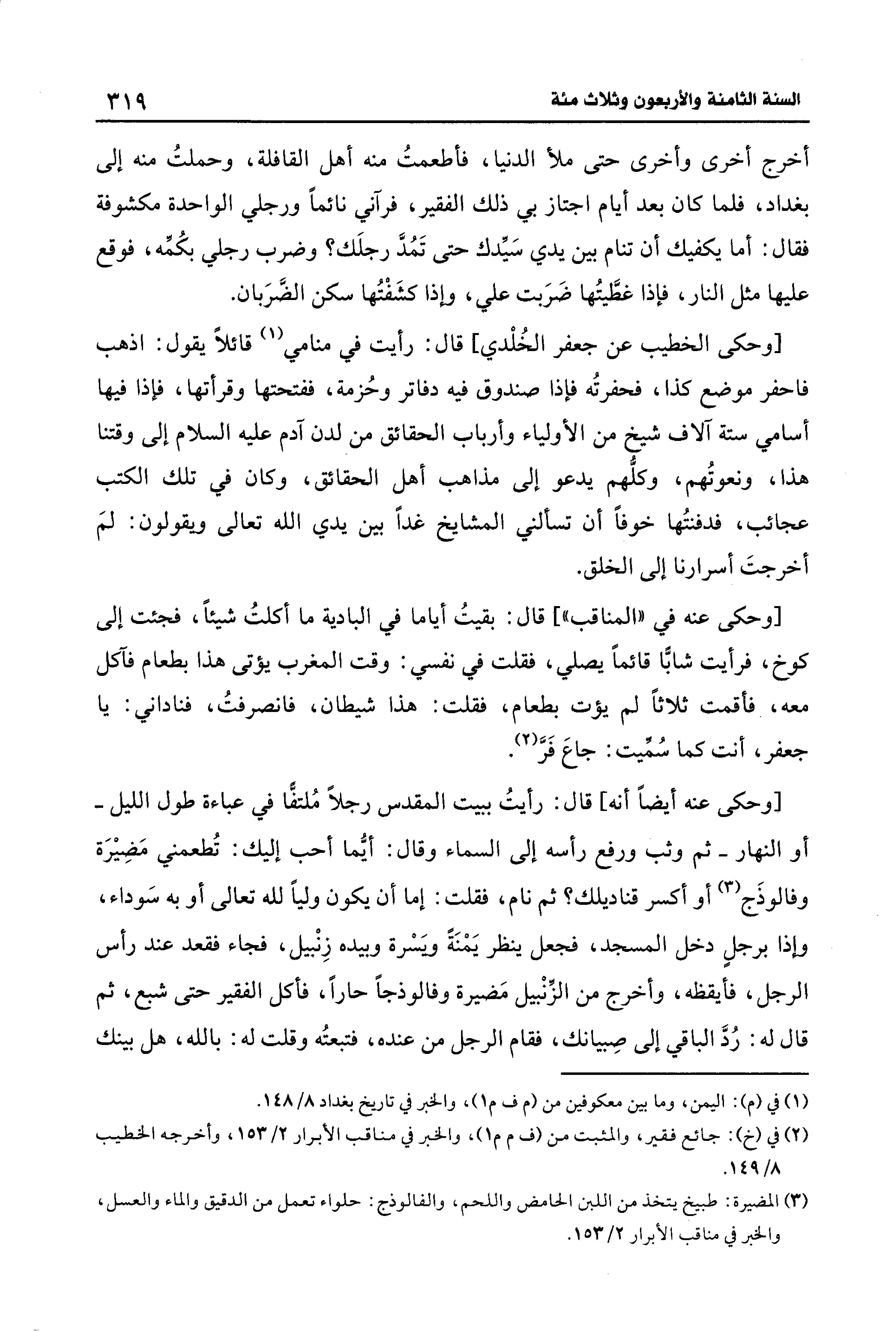 أخرج أخرى وأخرى حتى ملأ الدنيا، فأطعمتُ منه أهل القافلة، وحملتُ منه إلى بغداد، فلما كان بعد أيام اجتاز بي ذلك الففير، فرآني نائمًا ورجلي الواحدة مكشوفة فقال: أما يكفيك أن تنام بين يدي سَيِّدك حتى تَمُدَّ رجلَك؟ وضرب رجلي بكُمِّه، فوقع عليها مثل النار، فإذا غطَّيتُها ضَرَبت علي، وإذا كشَفْتُها سكن الضَّرَبان.