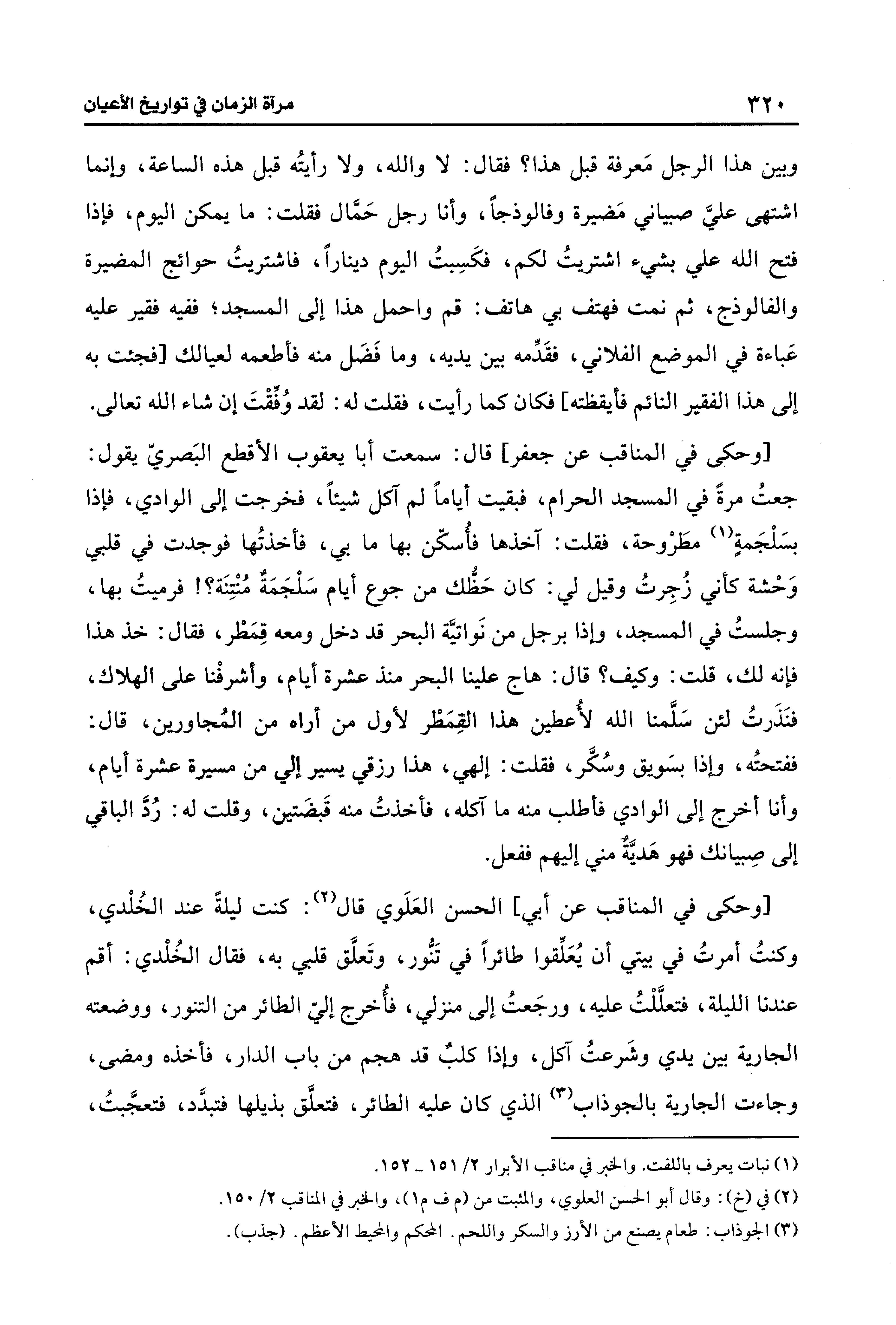 وبين هذا الرجل مَعرفة قبل هذا؟ فقال: لا والله، ولا رأيتُه قبل هذه الساعة، وإنما اشتهى عليَّ صبياني مَضيرة وفالوذجًا، وأنا رجل حَمَّال فقلت: ما يمكن اليوم، فإذا فتح الله علي بشيء اشتريتُ لكم، فكَسِبتُ اليوم دينارًا، فاشتريتُ حوائج المضيرة والفالوذج، ثم نمت فهتف بي هاتف: قم واحمل هذا إلى المسجد؛ ففيه فقير عليه عَباءة في الموضع الفلاني، فقَدِّمه بين يديه، وما فَضَل منه فأطعمه لعيالك [فجئت به إلى هذا الفقير النائم فأيقظته] فكان كما رأيت، فقلت له: لقد وُفِّقْتَ إن شاء الله تعالى.