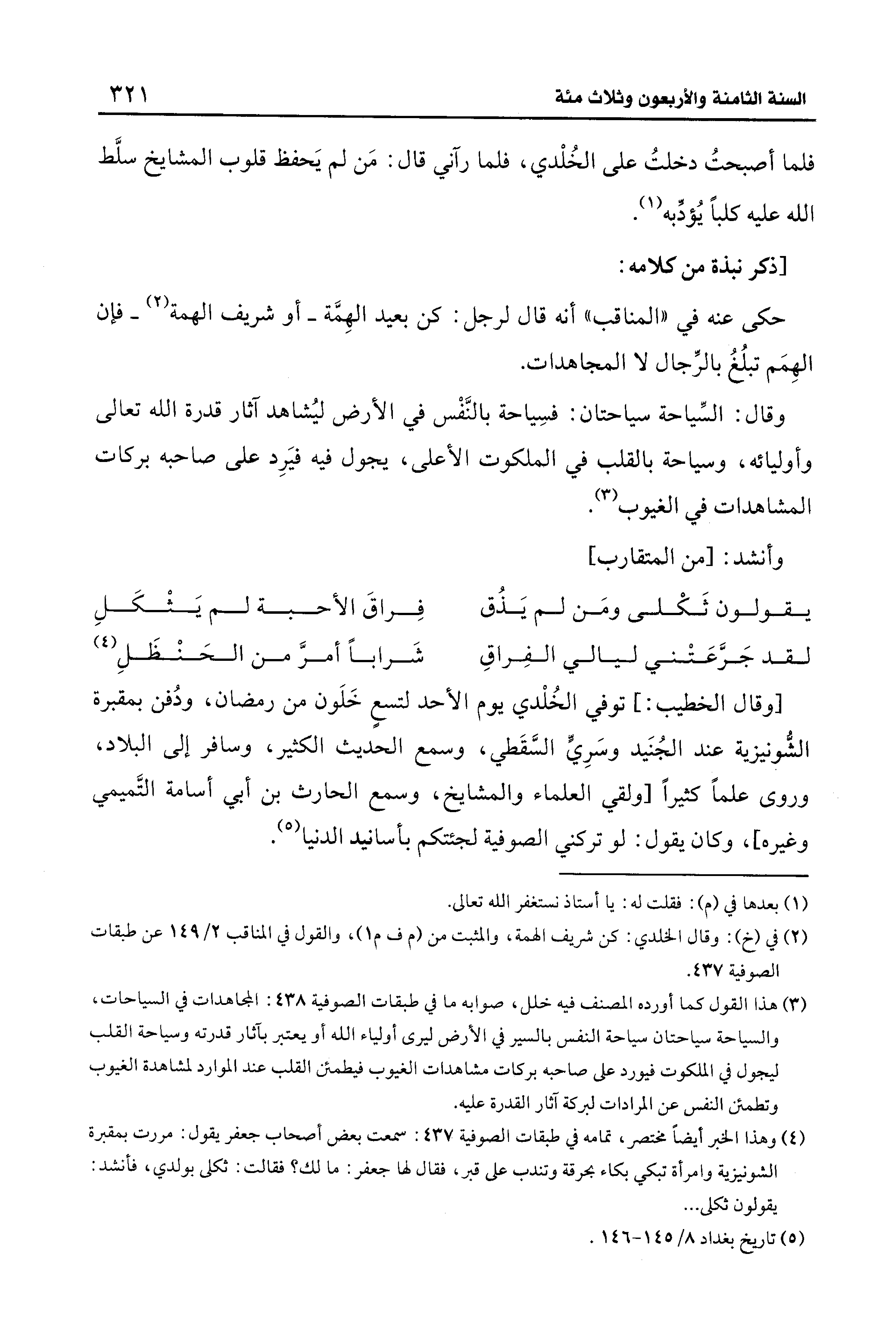 (¬4) وهذا الخبر أيضًا مختصر، تمامه في طبقات الصوفية 437: سمعت بعض أصحاب جعفر يقول: مررت بمقبرة الشونيزية وامرأة تبكي بكاء بحرقة وتندب على قبر، فقال لها جعفر: ما لك؟ فقالت: ثكلى بولدي، فأنشد: يقولون ثكلى ...