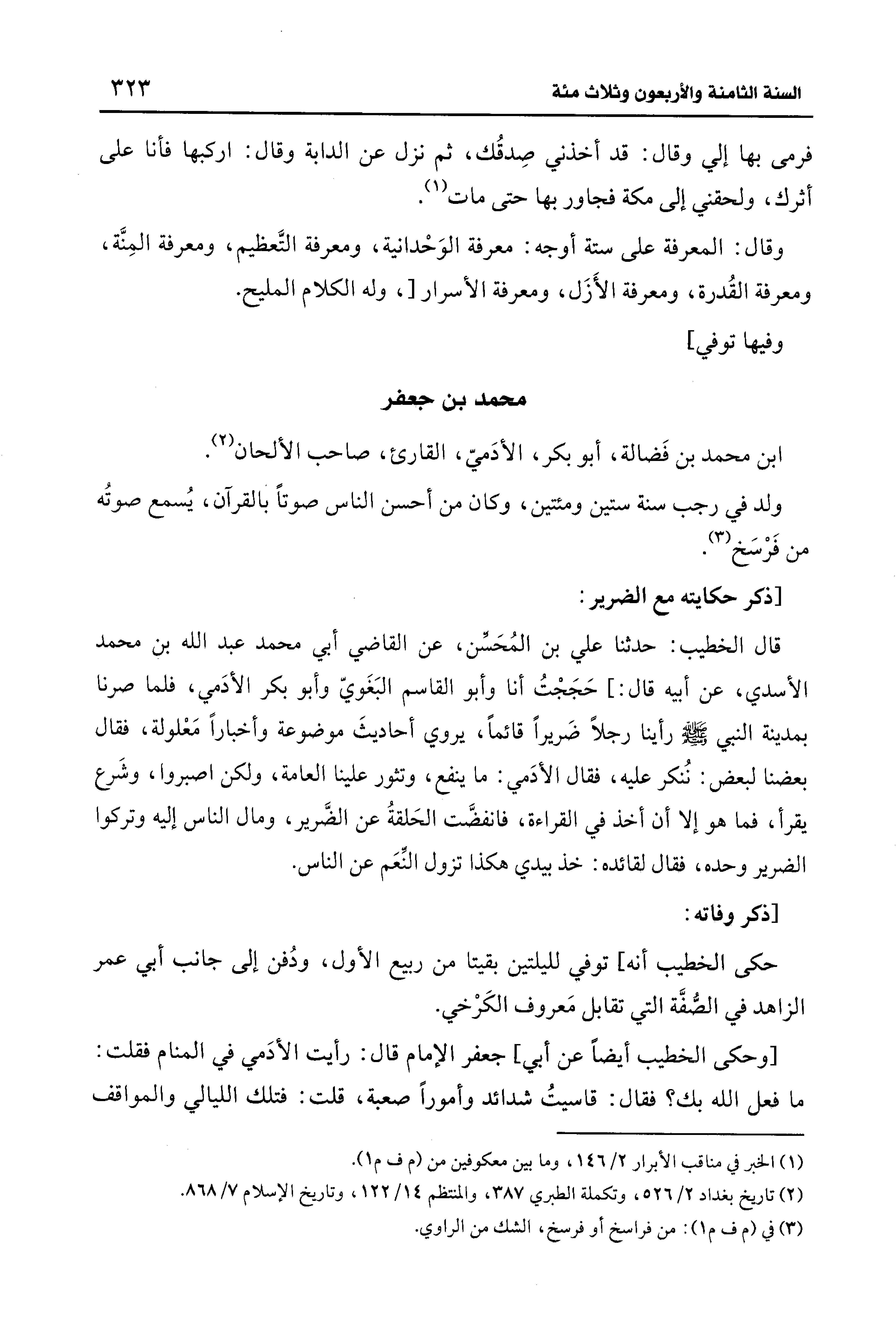 [وحكى الخطيب أيضًا عن أبي] جعفر الإِمام قال: رأيت الأدَمي في المنام فقلت: ما فعل الله بك؟ فقال: قاسيتُ شدائد وأمورًا صعبة، قلت: فتلك الليالي والمواقف