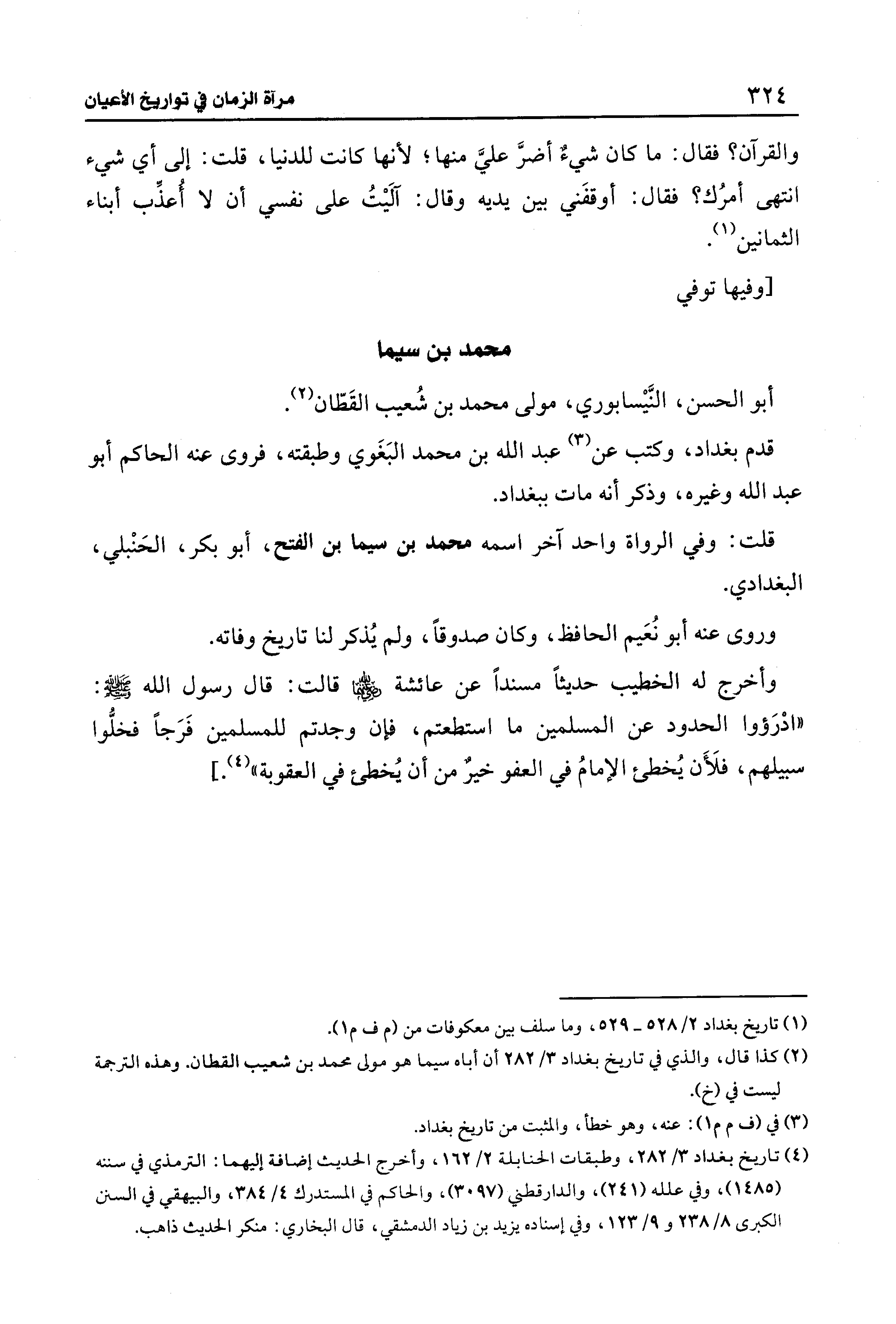 وأخرج له الخطيب حديثًا مسندًا عن عائشة - رضي الله عنها - قالت: قال رسول الله - صلى الله عليه وسلم -: "ادْرَؤوا الحدود عن المسلمين ما استطعتم، فإن وجدتم للمسلمين فَرَجًا فخلُّوا سبيلهم، فلَأَن يُخطئ الإمامُ في العفو خيرٌ من أن يُخطئ في العقوبة" (¬4).]