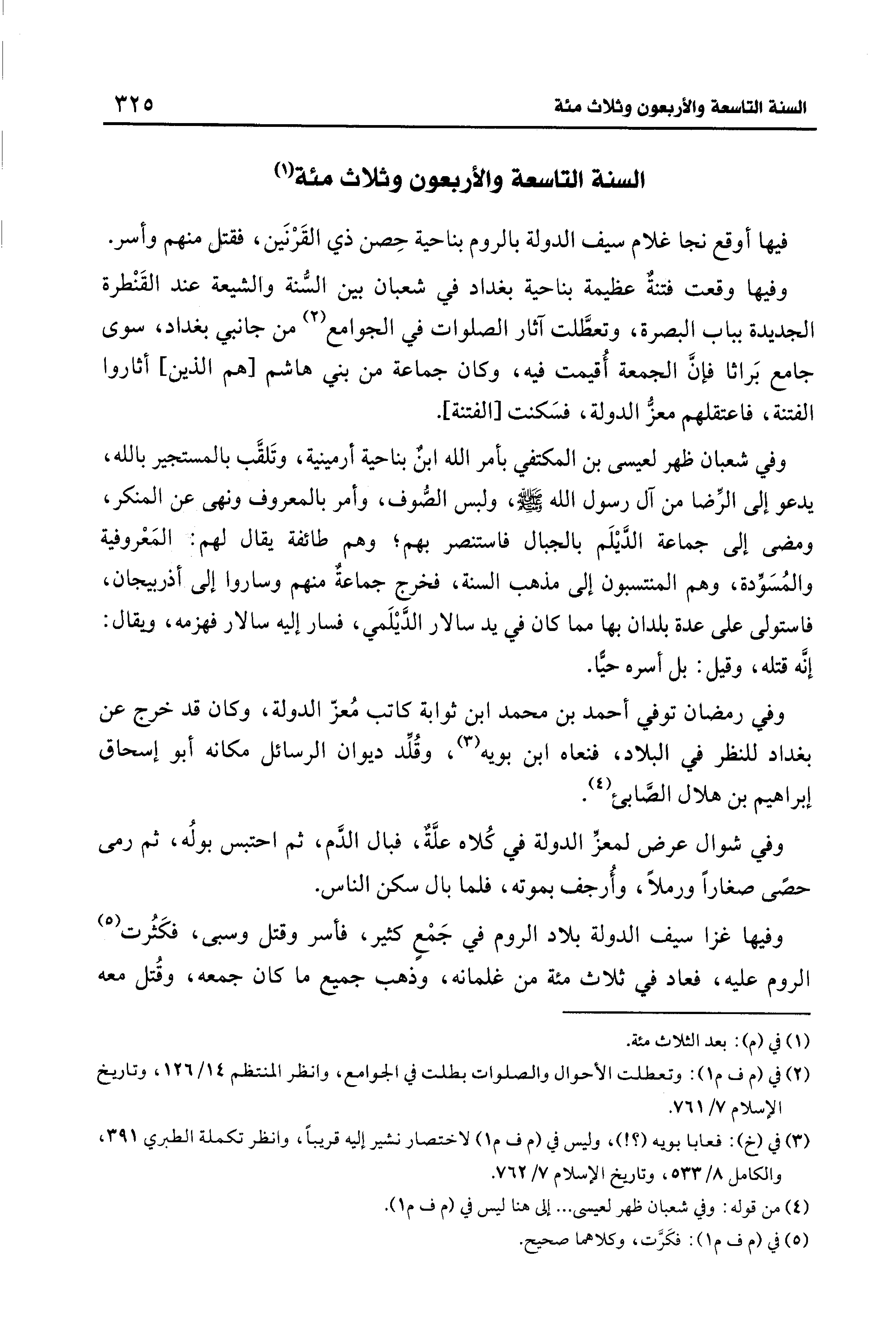 وفيها غزا سيف الدولة بلاد الروم في جَمْعٍ كثير، فأسر وقتل وسبى، فكَثُرت (¬5) الروم عليه، فعاد في ثلاث مئة من غلمانه، وذهب جميع ما كان جمعه، وقُتل معه