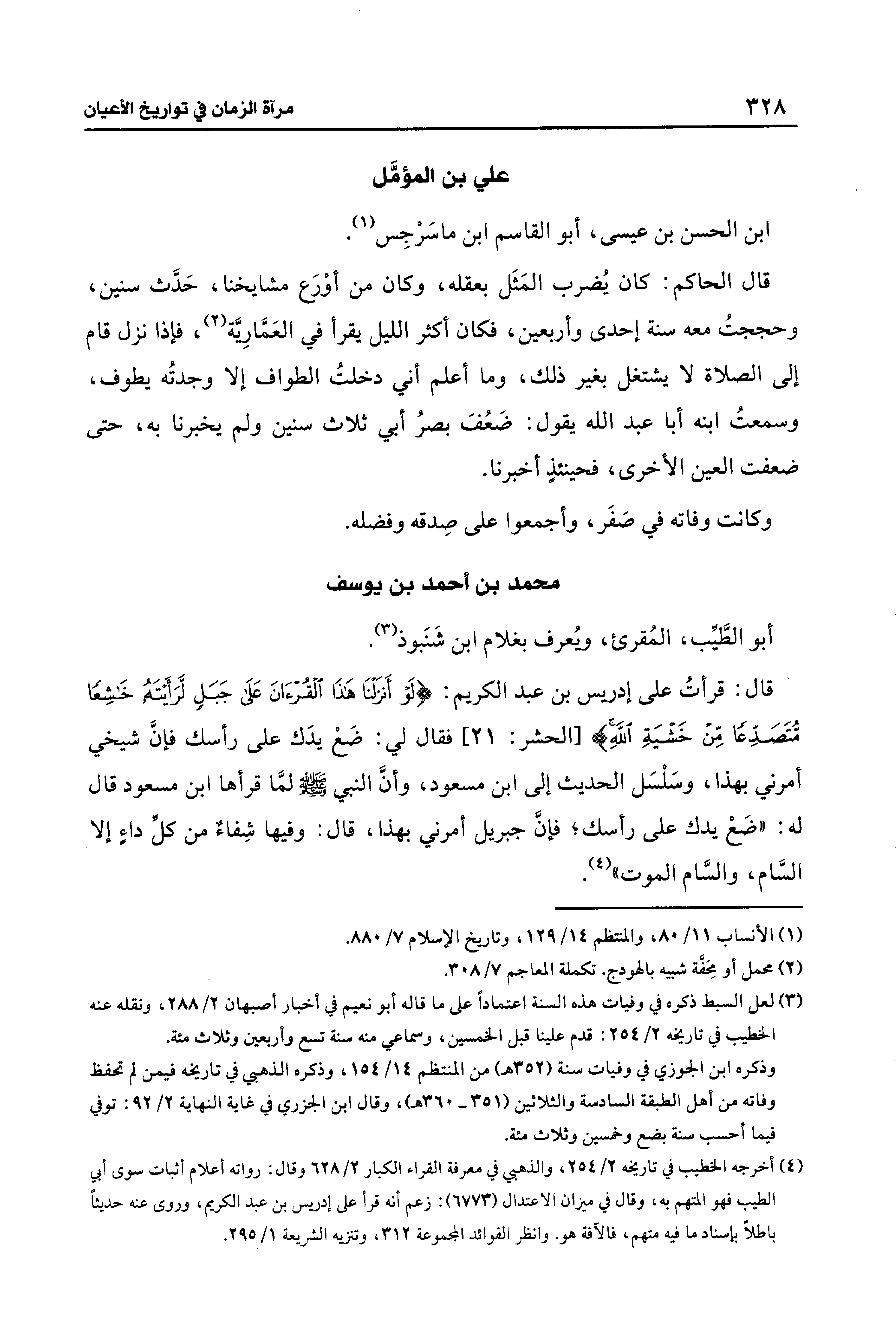 (¬3) لعل السبط ذكره في وفيات هذه السنة اعتمادًا على ما قاله أبو نعيم في أخبار أصبهان 2/ 288، ونقله عنه الخطيب في تاريخه 2/ 254: قدم علينا قبل الخمسين، وسماعي منه سنة تسع وأربعين وثلاث مئة.