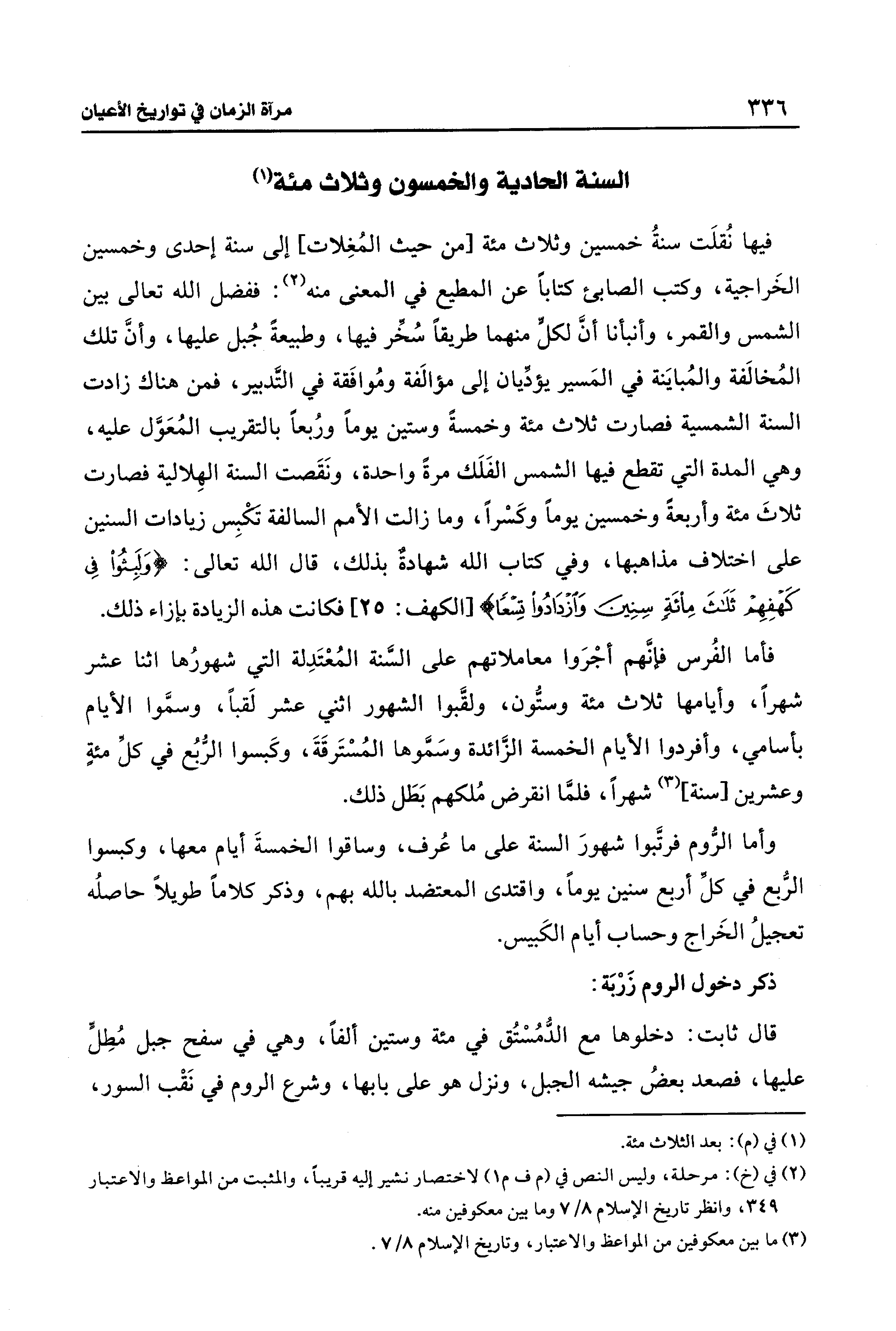 فيها نُقلَت سنةُ خمسين وثلاث مئة [من حيث المُغِلات] إلى سنة إحدى وخمسين الخَراجية، وكتب الصابئ كتابًا عن المطيع في المعنى منه (¬2): ففضل الله تعالى بين الشمس والقمر، وأنبأنا أنَّ لكلِّ منهما طريقًا سُخِّر فيها، وطبيعةً جُبل عليها، وأنَّ تلك المُخالفة والمُبايَنة في المَسير يؤدِّيان إلى مؤالفة ومُوافَقة في التدبير، فمن هناك زادت السنة الشمسية فصارت ثلاث مئة وخمسةً وستين يومًا ورُبعًا بالتقريب المُعَوَّل عليه، وهي المدة التي تقطع فيها الشمس الفَلَك مرةً واحدة، ونَقَصت السنة الهِلالية فصارت ثلاثَ مئة وأربعةً وخمسين يومًا وكَسْرًا، وما زالت الأمم السالفة تَكْبِس زيادات السنين على اختلاف مذاهبها، وفي كتاب الله شهادةٌ بذلك، قال الله تعالى: {وَلَبِثُوا فِي كَهْفِهِمْ ثَلَاثَ مِائَةٍ سِنِينَ وَازْدَادُوا تِسْعًا} [الكهف: 25] فكانت هذه الزيادة بإزاء ذلك.