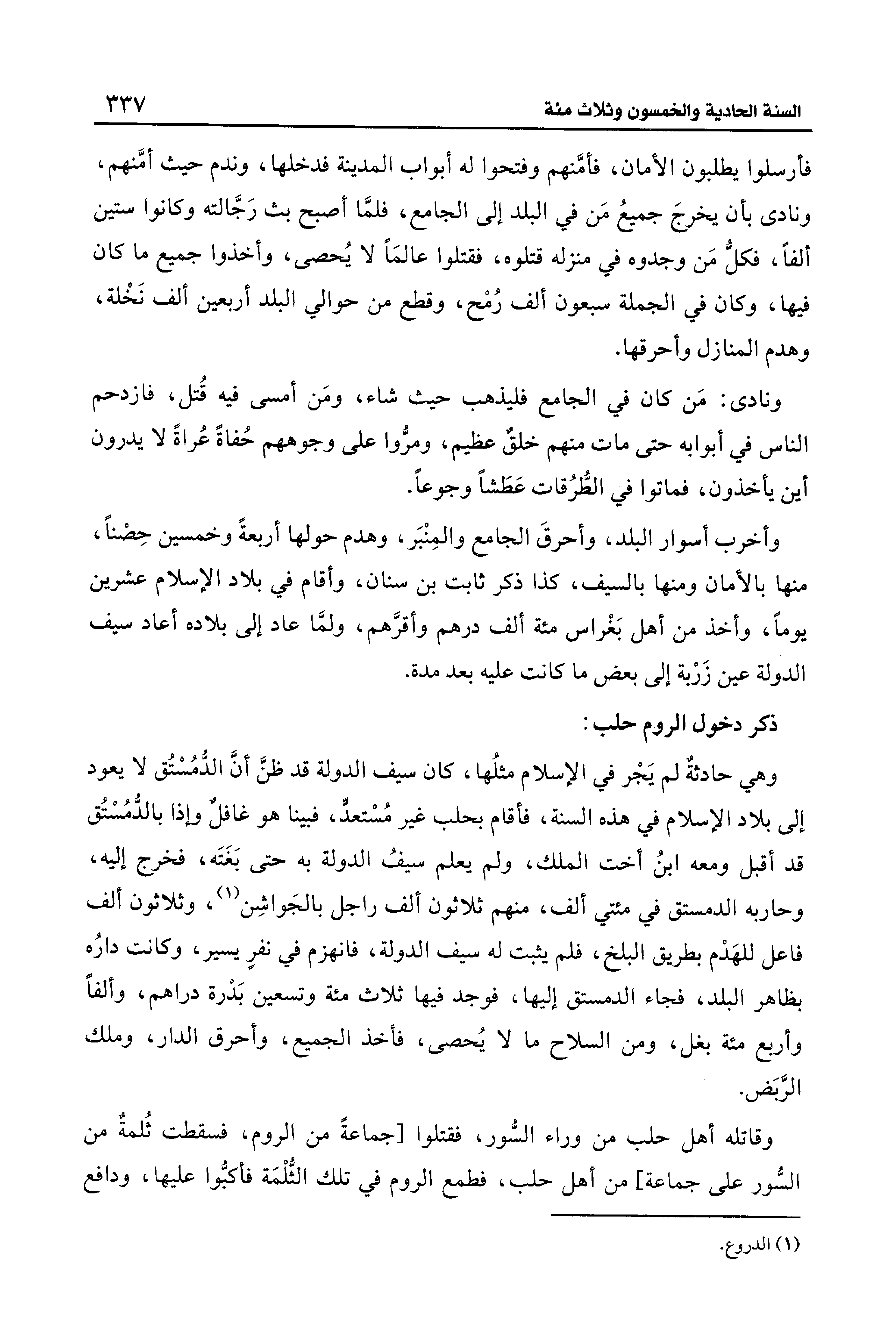 وهي حادثةٌ لم يَجْر في الإسلام مثلُها، كان سيف الدولة قد ظنَّ أنَّ الدُّمُسْتُق لا يعود إلى بلاد الإسلام في هذه السنة، فأقام بحلب غير مُسْتعدٍّ، فبينا هو غافلٌ وإذا بالدُّمُسْتُق قد أقبل ومعه ابنُ أخت الملك، ولم يعلم سيفُ الدولة به حتى بَغَتَه، فخرج إليه، وحاربه الدمستق في مئتي ألف، منهم ثلاثون ألف راجل بالجَواشِن (¬1)، وثلاثون ألف فاعل للهَدْم بطريق البلخ، فلم يثبت له سيف الدولة، فانهزم في نفرٍ يسير، وكانت دارُه بظاهر البلد، فجاء الدمستق إليها، فوجد فيها ثلاث مئة وتسعين بَدْرة دراهم، وألفًا وأربع مئة بغل، ومن السلاح ما لا يُحصى، فأخذ الجميع، وأحرق الدار، وملك الرَّبَض.