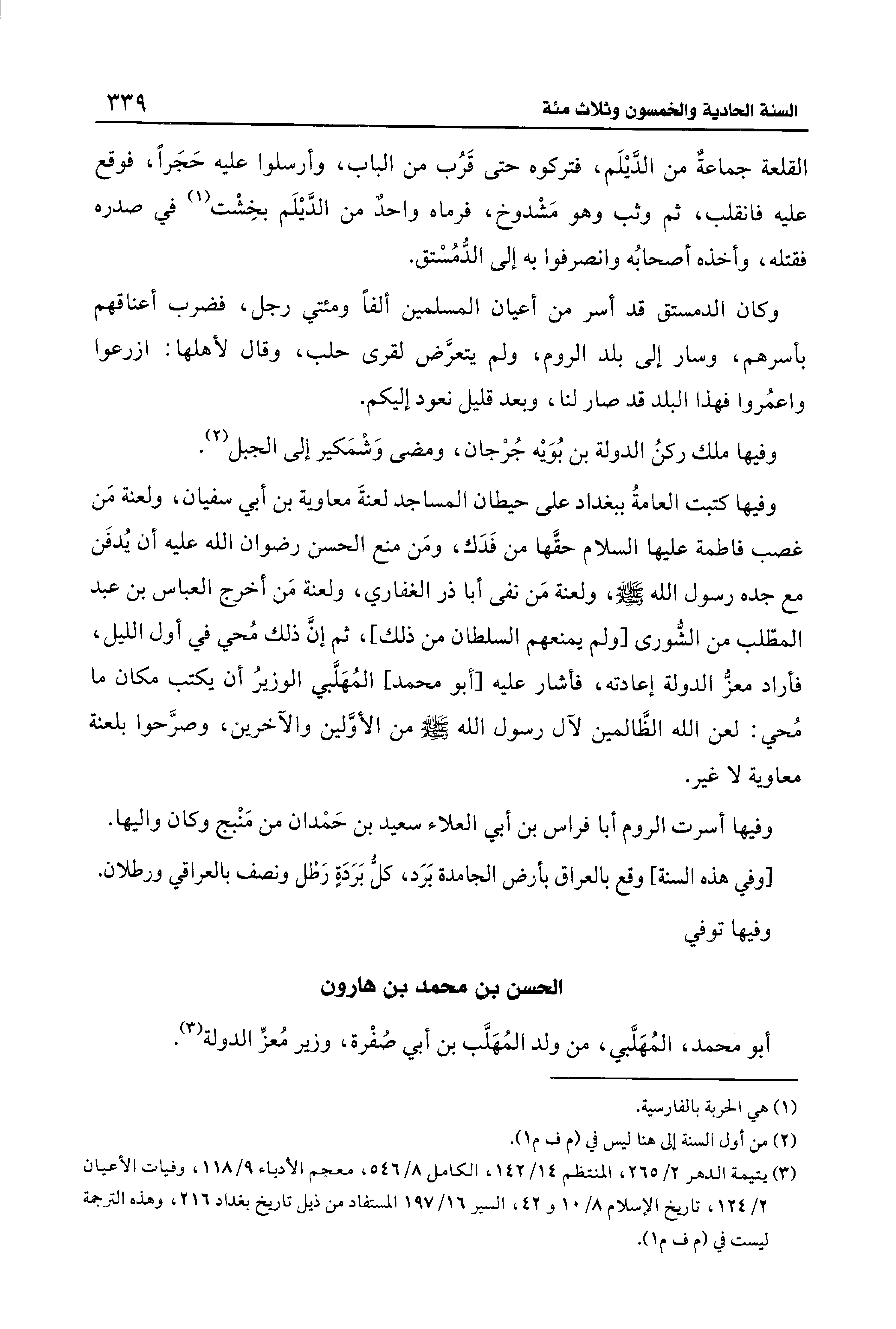 وفيها كتبت العامةُ ببغداد على حيطان المساجد لعنةَ معاوية بن أبي سفيان، ولعنة مَن غصب فاطمة عليها السلام حقَّها من فَدَك، ومَن منع الحسن رضوان الله عليه أن يُدفَن مع جده رسول الله - صلى الله عليه وسلم -، ولعنة مَن نفى أبا ذر الغفاري، ولعنة مَن أخرج العباس بن عبد المطّلب من الشُّورى [ولم يمنعهم السلطان من ذلك] ثم إنَّ ذلك مُحي في أول الليل، فأراد معزُّ الدولة إعادته، فأشار عليه [أبو محمَّد] المُهَلَّبي الوزيرُ أن يكتب مكان ما مُحي: لعن الله الظَّالمين لآل رسولًا الله - صلى الله عليه وسلم - من الأوَّلين والآخرين، وصرَّحوا بلعنة معاوية لا غير.