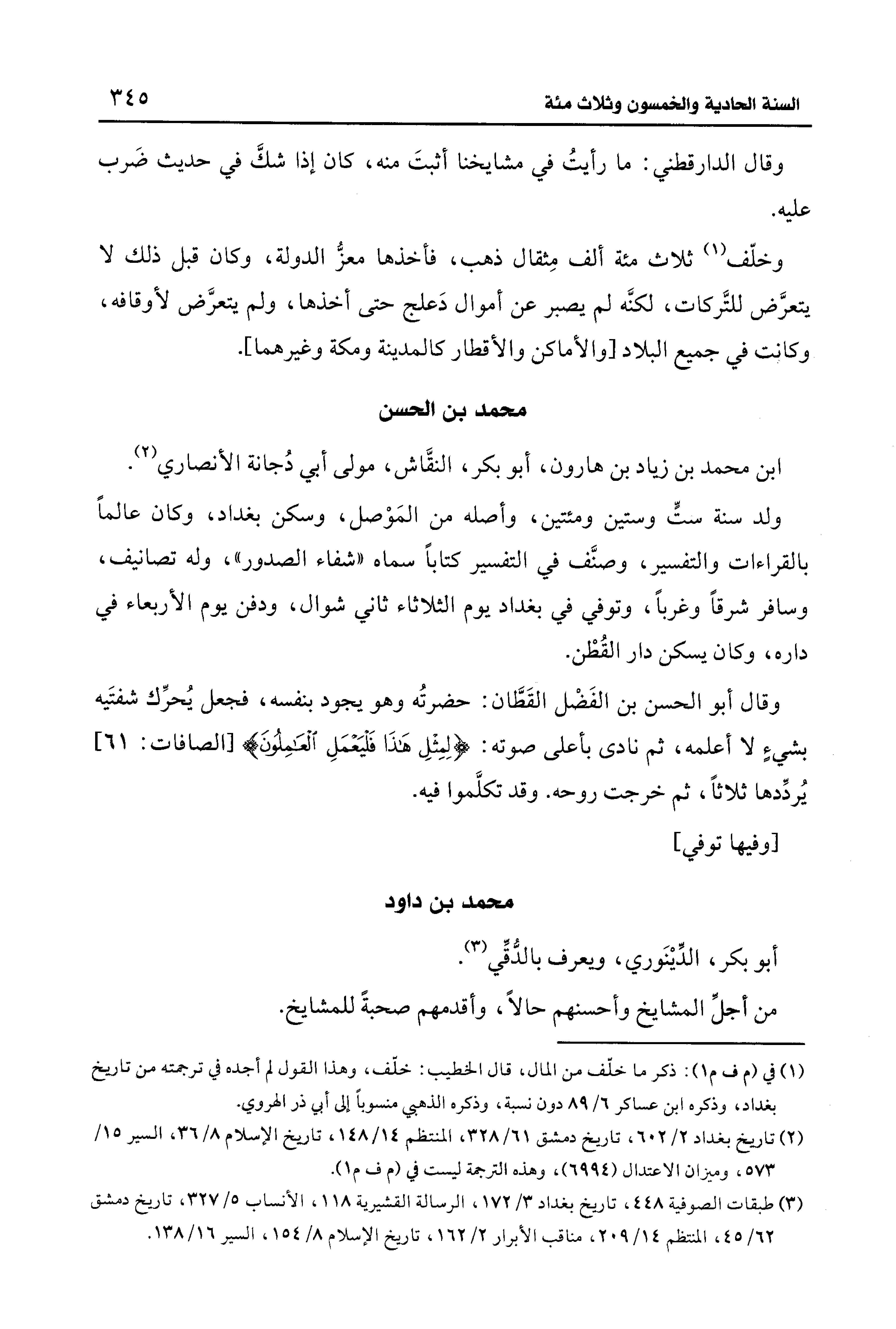 (¬3) طبقات الصوفية 448، تاريخ بغداد 3/ 172، الرسالة القشيرية 118، الأنساب 5/ 327، تاريخ دمشق 62/ 45، المنتظم 14/ 209، مناقب الأبرار 2/ 162، تاريخ الإِسلام 8/ 154، السير 16/ 138.