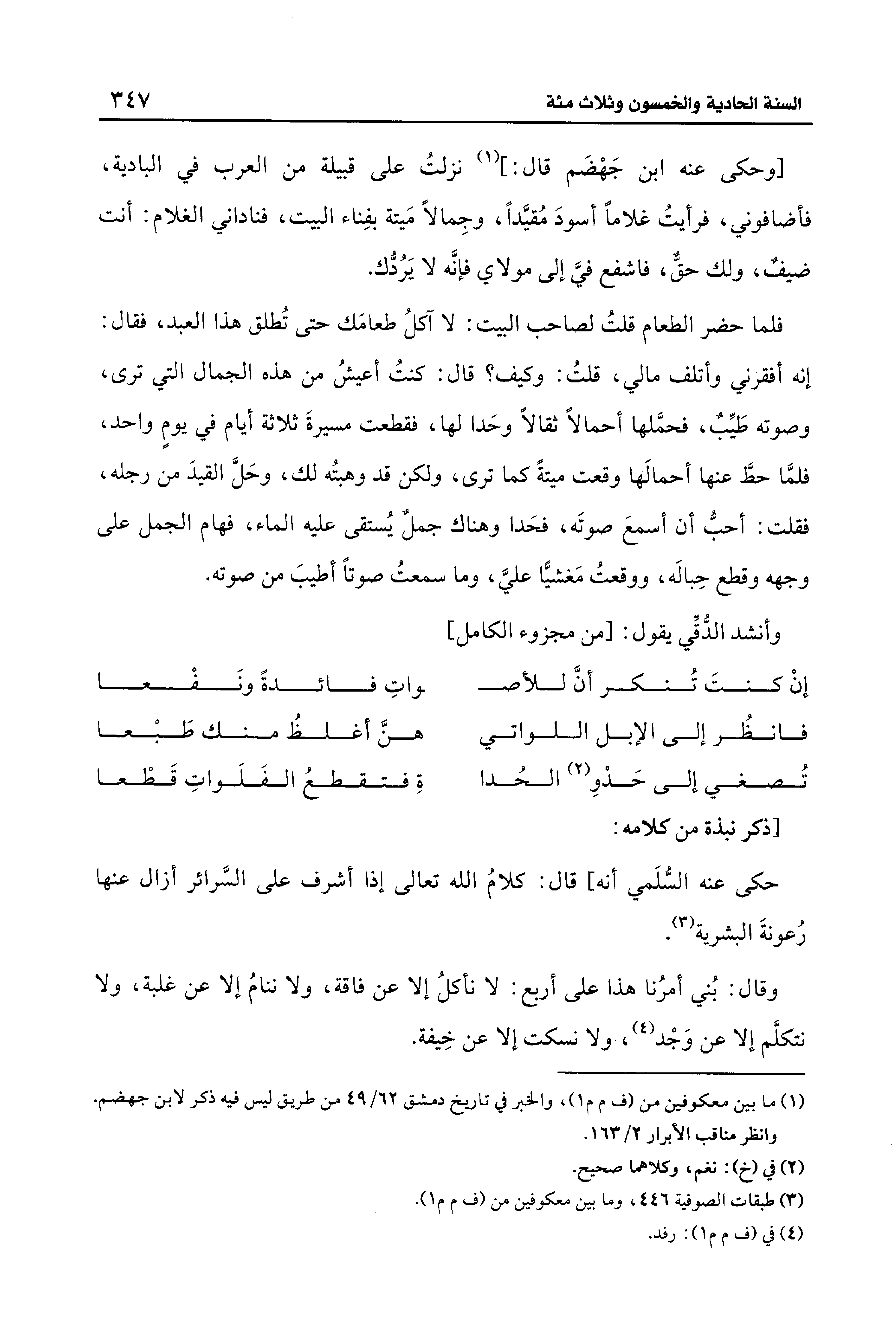 فلما حضر الطعام قلتُ لصاحب البيت: لا آكلُ طعامَك حتى تُطلق هذا العبد، فقال: إنه أفقرني وأتلف مالي، قلتُ: وكيف؟ قال: كنتُ أعيشُ من هذه الجمال التي ترى، وصوته طَيِّبٌ، فحمَّلها أحمالًا ثقالًا وحَدا لها، فقطعت مسيرةَ ثلاثة أيام في يومٍ واحد، فلمَّا حطَّ عنها أحمالها وقعت ميتةً كما ترى، ولكن قد وهبتُه لك، وحَلَّ القيدَ من رجله، فقلت: أحبُّ أن أسمعَ صوتَه، فحَدا وهناك جملٌ يُستقى عليه الماء، فهام الجمل على وجهه وقطع حِباله، ووقعتُ مَغشيًّا عليَّ، وما سمعتُ صوتًا أطيبَ من صوته.