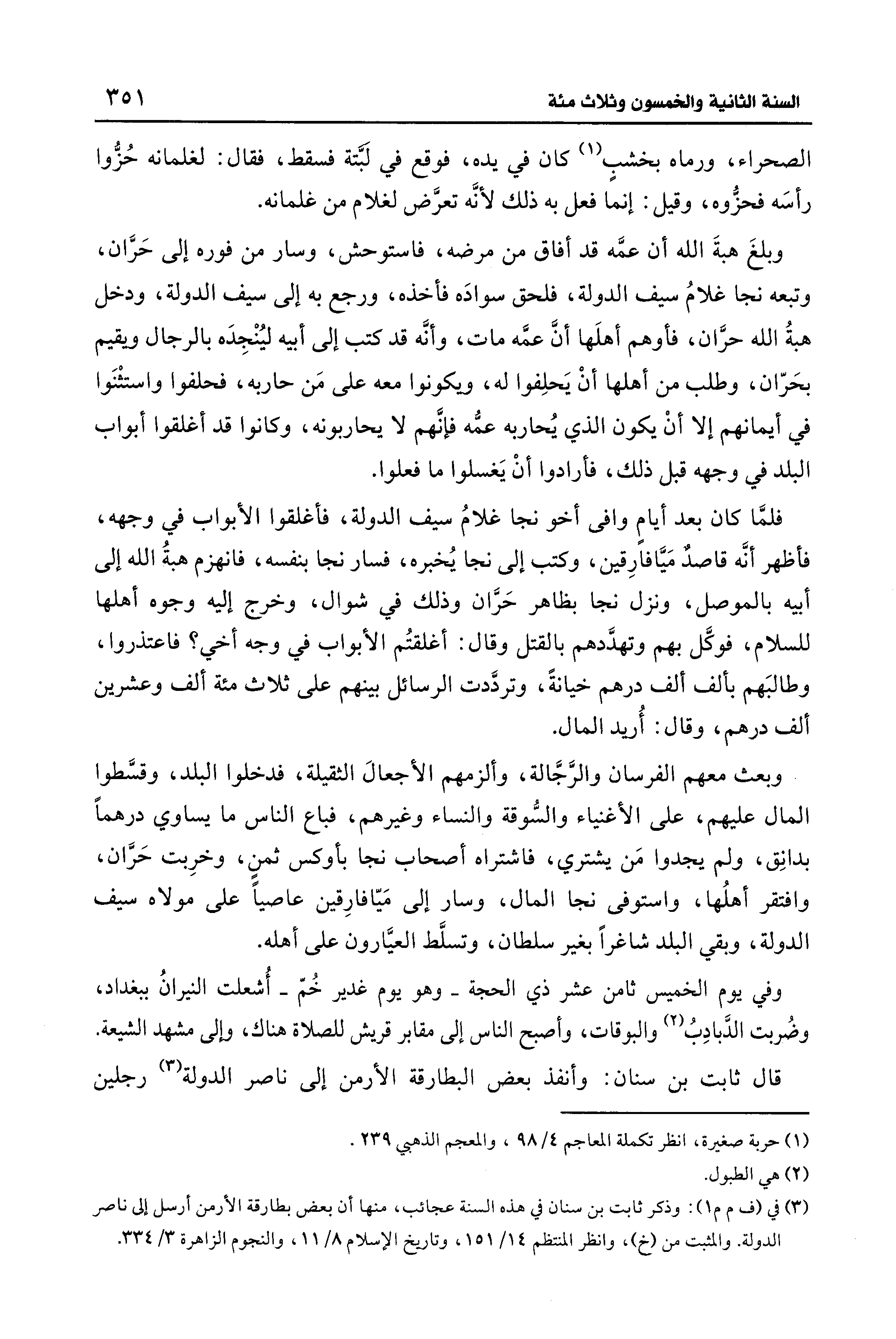 (¬3) في (ف م م 1): وذكر ثابت بن سنان في هذه السنة عجائب، منها أن بعض بطارقة الأرمن أرسل إلى ناصر الدولة. والمثبت من (خ)، وانظر المنتظم 14/ 151، وتاريخ الإِسلام 8/ 11، والنجوم الزاهرة 3/ 334.