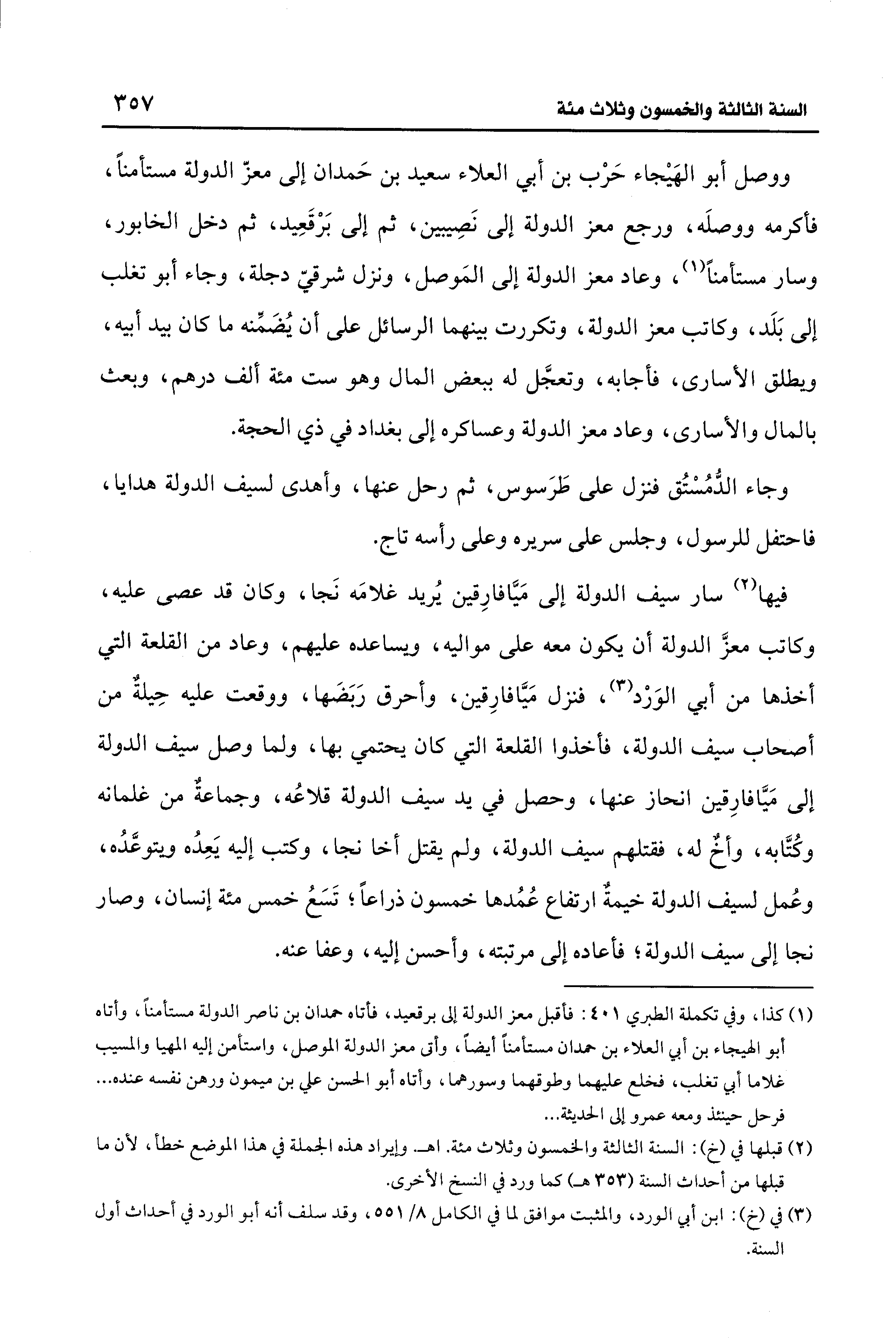 (¬2) قبلها في (خ): السنة الثالثة والخمسون وثلاث مئة. اهـ. وإيراد هذه الجملة في هذا الموضع خطأ؛ لأن ما قبلها من أحداث السنة (353 هـ) كما ورد في النسخ الأخرى.