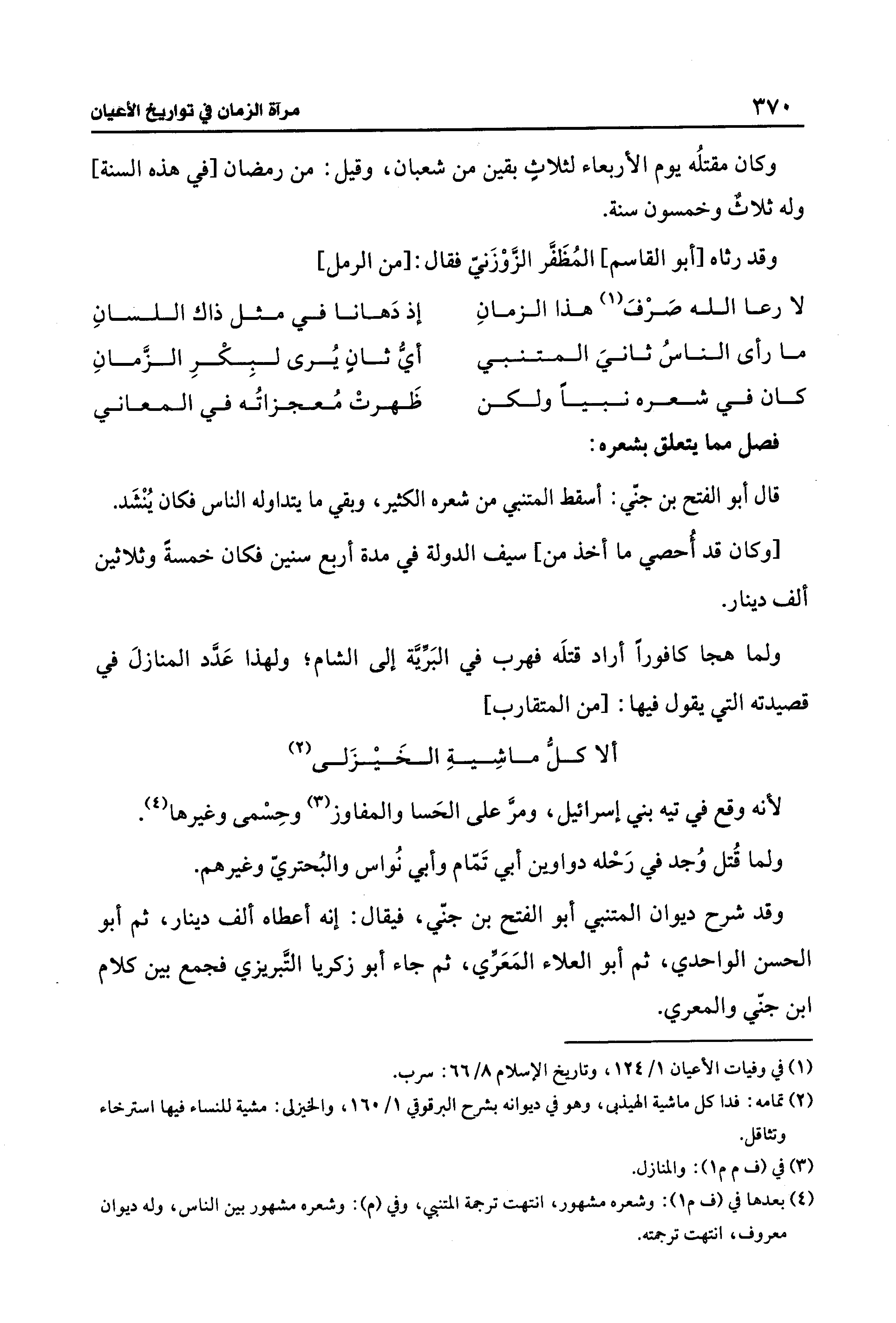 (¬4) بعدها في (ف م 1): وشعره مشهور، انتهت ترجمة المتنبي، وفي (م): وشعره مشهور بين الناس، وله ديوان معروف، انتهت ترجمته.