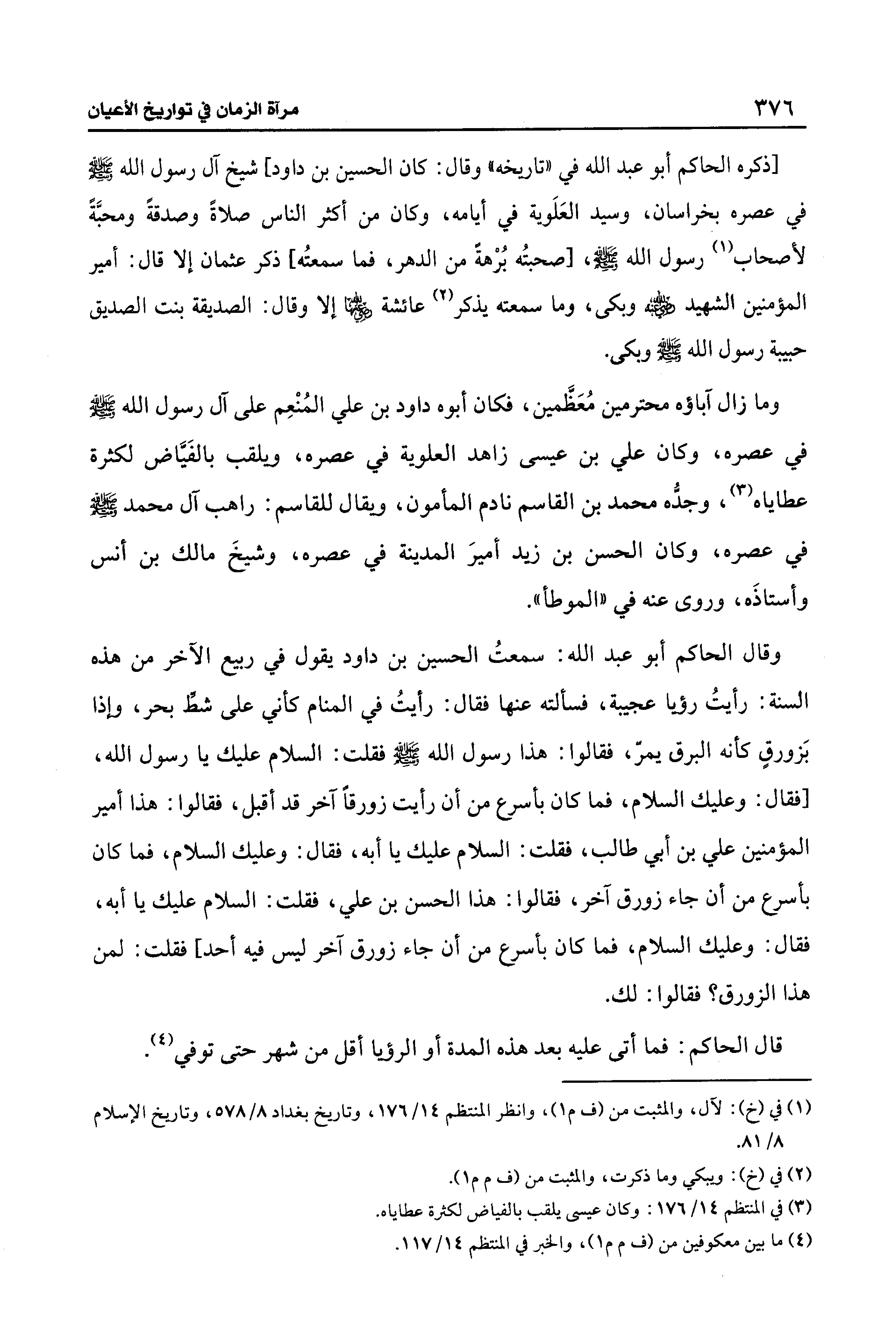 وقال الحاكم أبو عبد الله: سمعتُ الحسين بن داود يقول في ربيع الآخر من هذه السنة: رأيتُ رؤيا عجيبة، فسألته عنها فقال: رأيتُ في المنام كأني على شطِّ بحر، وإذا بَزورقٍ كأنه البرق يمرّ، فقالوا: هذا رسول الله - صلى الله عليه وسلم - فقلت: السلام عليك يا رسول الله، [فقال: وعليك السلام، فما كان بأسرع من أن رأيت زورقًا آخر قد أقبل، فقالوا: هذا أمير المؤمنين علي بن أبي طالب، فقلت: السلام عليك يا أبه، فقال: وعليك السلام، فما كان بأسرع من أن جاء زورق آخر، فقالوا: هذا الحسن بن علي، فقلت: السلام عليك يا أبه، فقال: وعليك السلام، فما كان بأسرع من أن جاء زورق آخر ليس فيه أحد، فقلت: لمن هذا الزورق؟ فقالوا: لك.