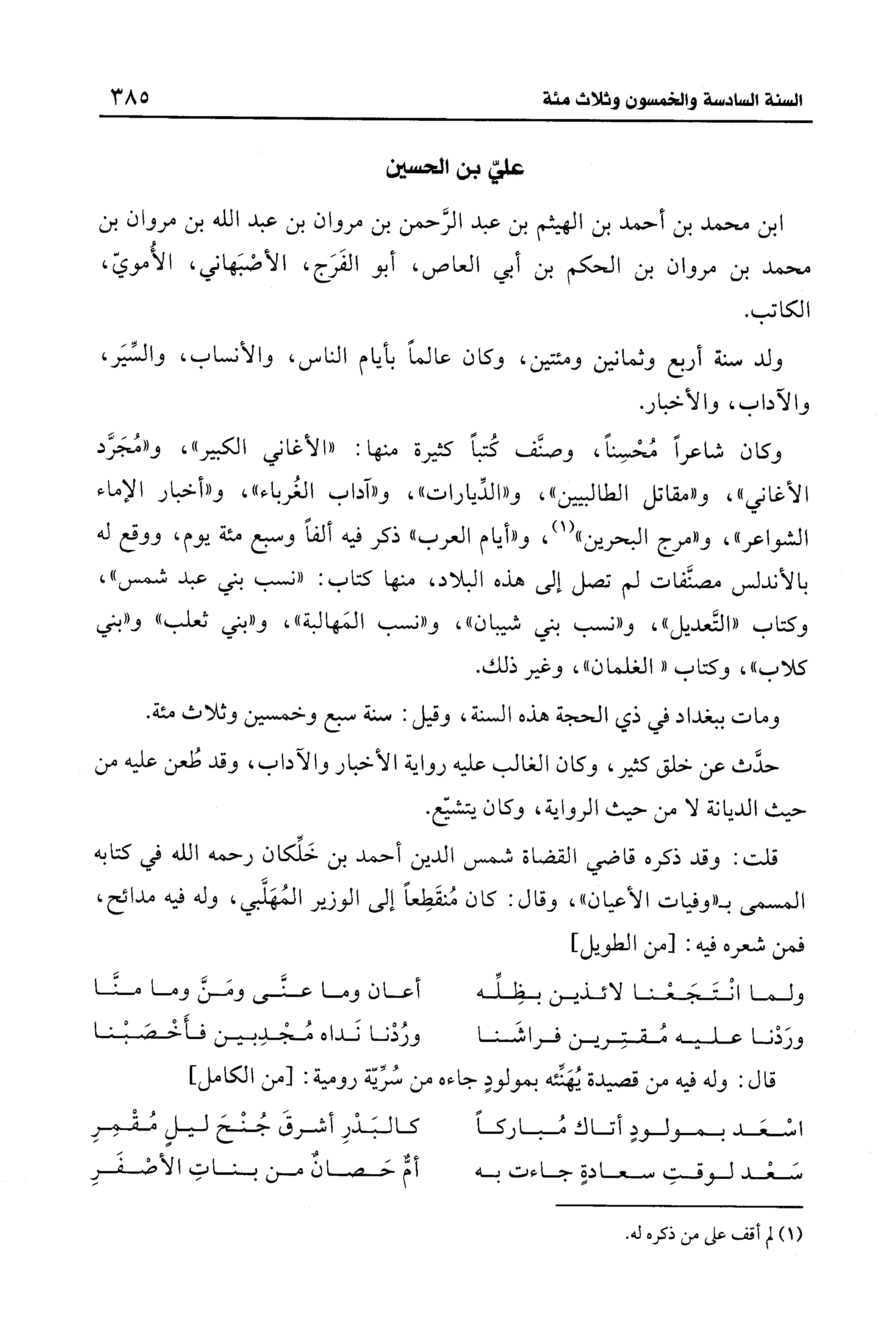 وكان شاعرًا مُحْسِنًا، وصنَّف كُتبًا كثيرة منها: "الأغاني الكبير"، و"مُجَرَّد الأغاني"، و"مقاتل الطالبيين"، و"الدِّيارات"، و"آداب الغُرباء"، و"أخبار الإماء الشواعر"، و"مرج البحرين" (¬1)، و"أيام العرب" ذكر فيه ألفًا وسبع مئة يوم، ووقع له بالأندلس مصنَّفات لم تصل إلى هذه البلاد، منها كتاب: "نسب بني عبد شمس"، وكتاب "التَّعديل"، و"نسب بني شيبان"، و"نسب المَهالبة"، و"بني ثعلب" و"بني كلاب"، وكتاب "الغلمان"، وغير ذلك.