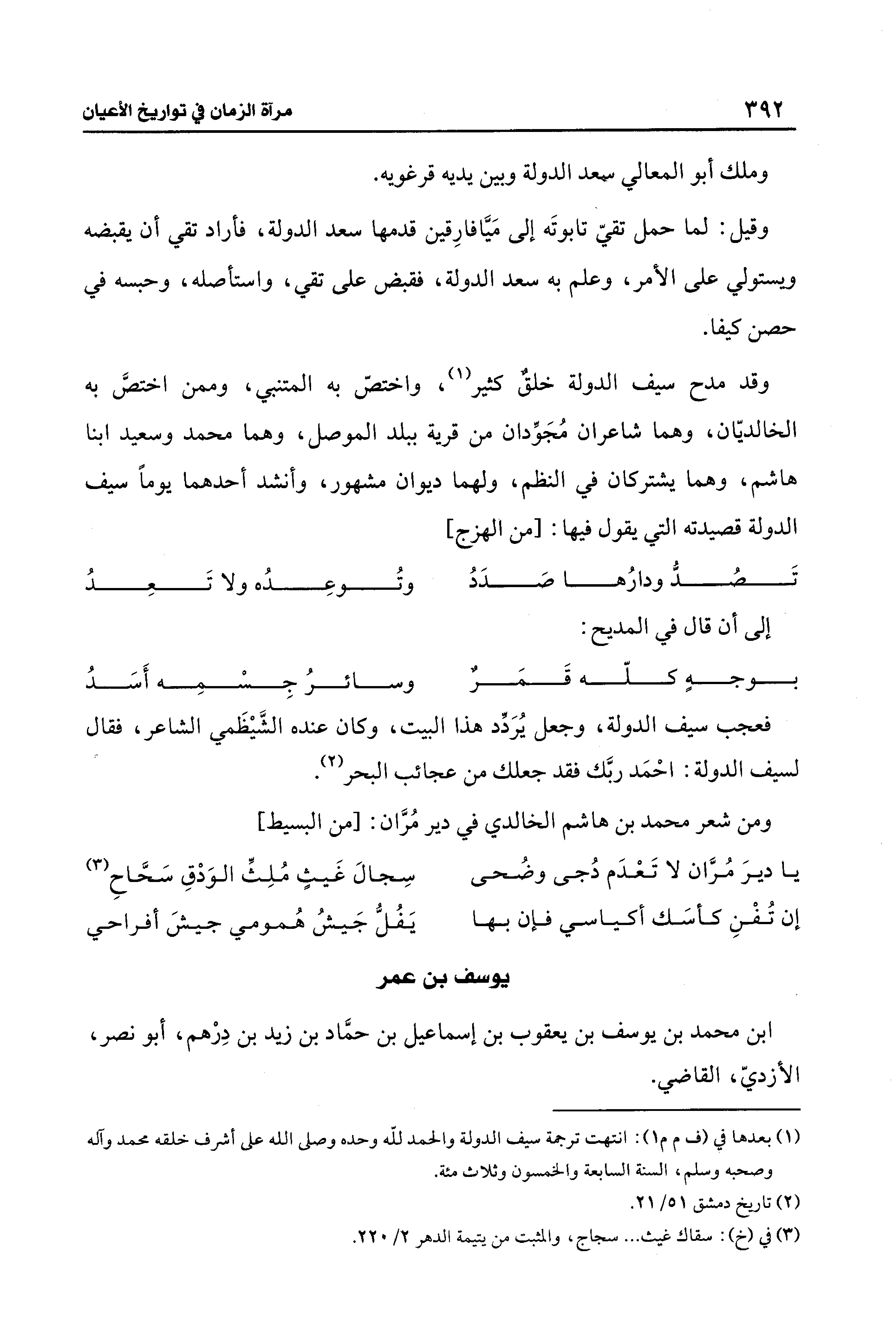 وقد مدح سيف الدولة خلق كثير (¬1)، واختصّ به المتنبي، وممن اختصَّ به الخالديّان، وهما شاعران مُجَوِّدان من قرية ببلد الموصل، وهما محمَّد وسعيد ابنا هاشم، وهما يشتركان في النظم، ولهما ديوان مشهور، وأنشد أحدهما يومًا سيف الدولة قصيدته التي يقول فيها: [من الهزج]