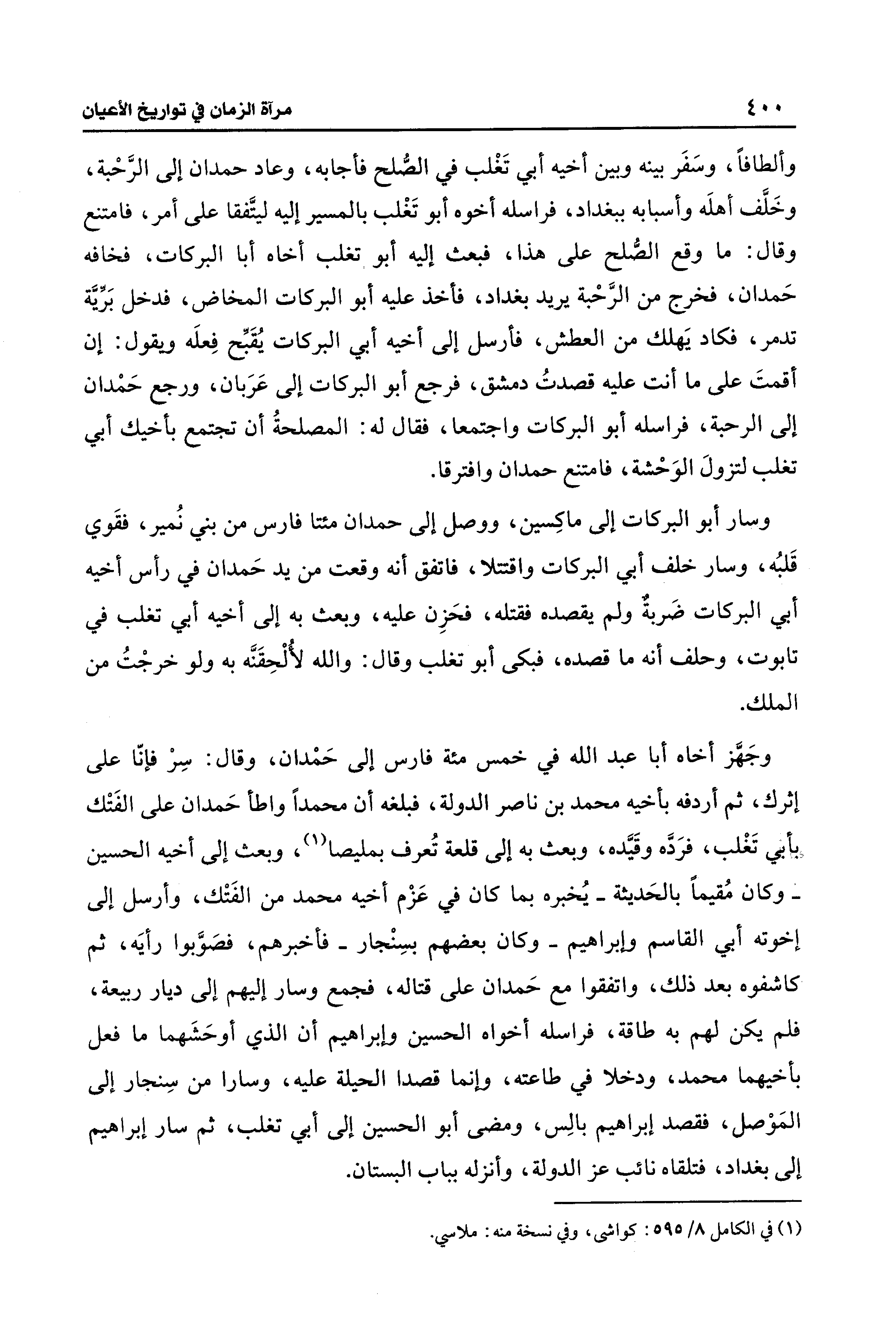 وألطافًا، وسَفَر بينه وبين أخيه أبي تَغْلب في الصُّلح فأجابه، وعاد حمدان إلى الرَّحْبة، وخَلَّف أهلَه وأسبابه ببغداد، فراسله أخوه أبو تَغْلب بالمسير إليه ليتَّفقا على أمر، فامتنع وقال: ما وقع الصُّلح على هذا، فبعث إليه أبو تغلب أخاه أبا البركات، فخافه حَمدان، فخرج من الرَّحْبة يريد بغداد، فأخذ عليه أبو البركات المخاض، فدخل بَرّيَّة تدمر، فكاد يَهلك من العطش، فأرسل إلى أخيه أبي البركات يُقَبِّح فِعلَه ويقول: إن أقمتَ على ما أنت عليه قصدتُ دمشق، فرجع أبو البركات إلى عَرَبان، ورجع حَمْدان إلى الرحبة، فراسله أبو البركات واجتمعا، فقال له: المصلحةُ أن تجتمع بأخيك أبي تغلب لتزولَ الوَحْشة، فامتنع حمدان وافترقا.