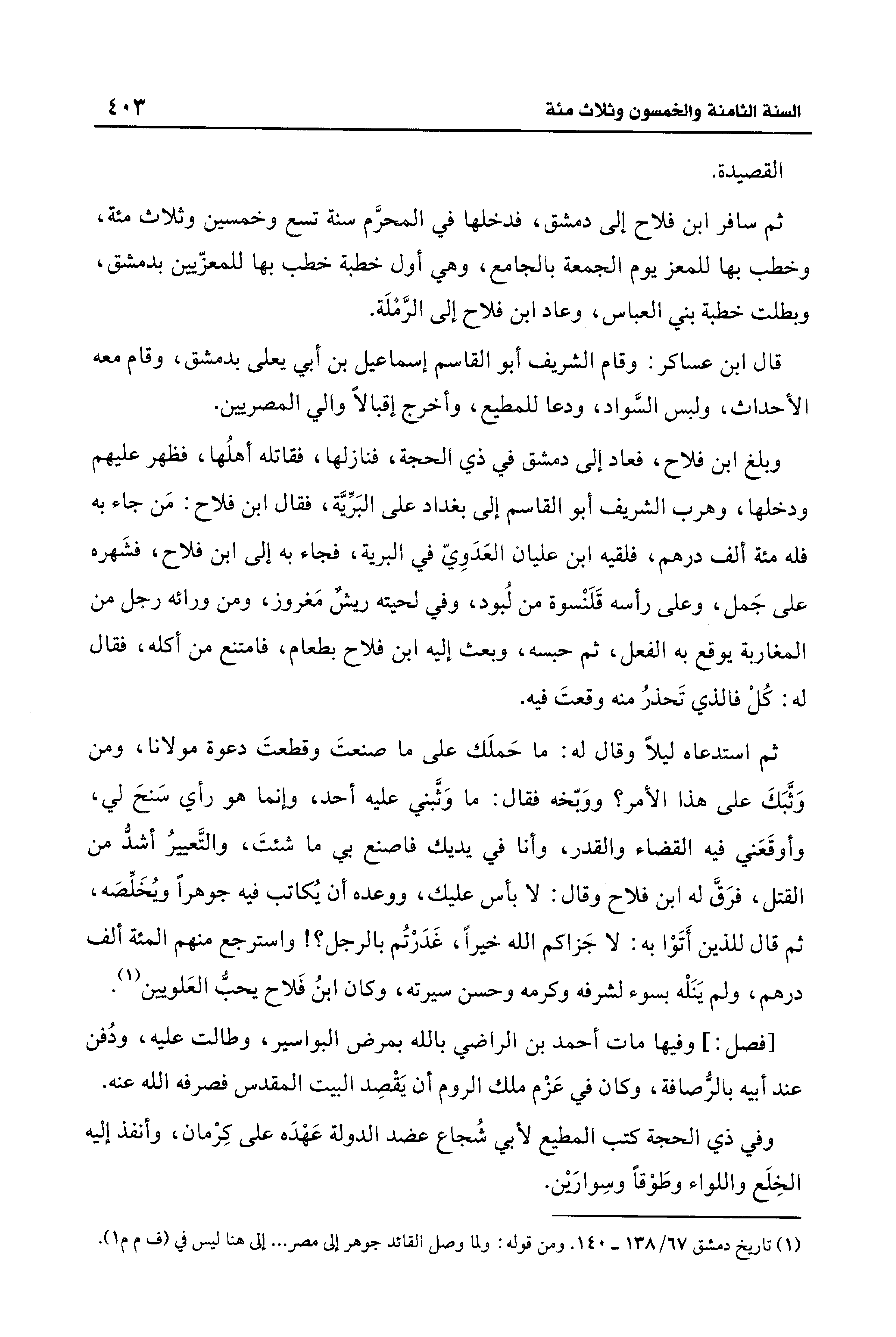 وبلغ ابن فلاح، فعاد إلى دمشق في ذي الحجة، فنازلها، فقاتله أهلُها، فظهر عليهم ودخلها، وهرب الشريف أبو القاسم إلى بغداد على البَرِّيَّة، فقال ابن فلاح: مَن جاء به فله مئة ألف درهم، فلقيه ابن عليان العَدَويّ في البرية، فجاء به إلى ابن فلاح، فشَهره على جَمل، وعلى رأسه قَلَنْسوة من لُبود، وفي لحيته ريشٌ مَغروز، ومن ورائه رجل من المغاربة يوقع به الفعل، ثم حبسه، وبعث إليه ابن فلاح بطعام، فامتنع من أكله، فقال له: كُل فالذي تَحذرُ منه وقعتَ فيه.