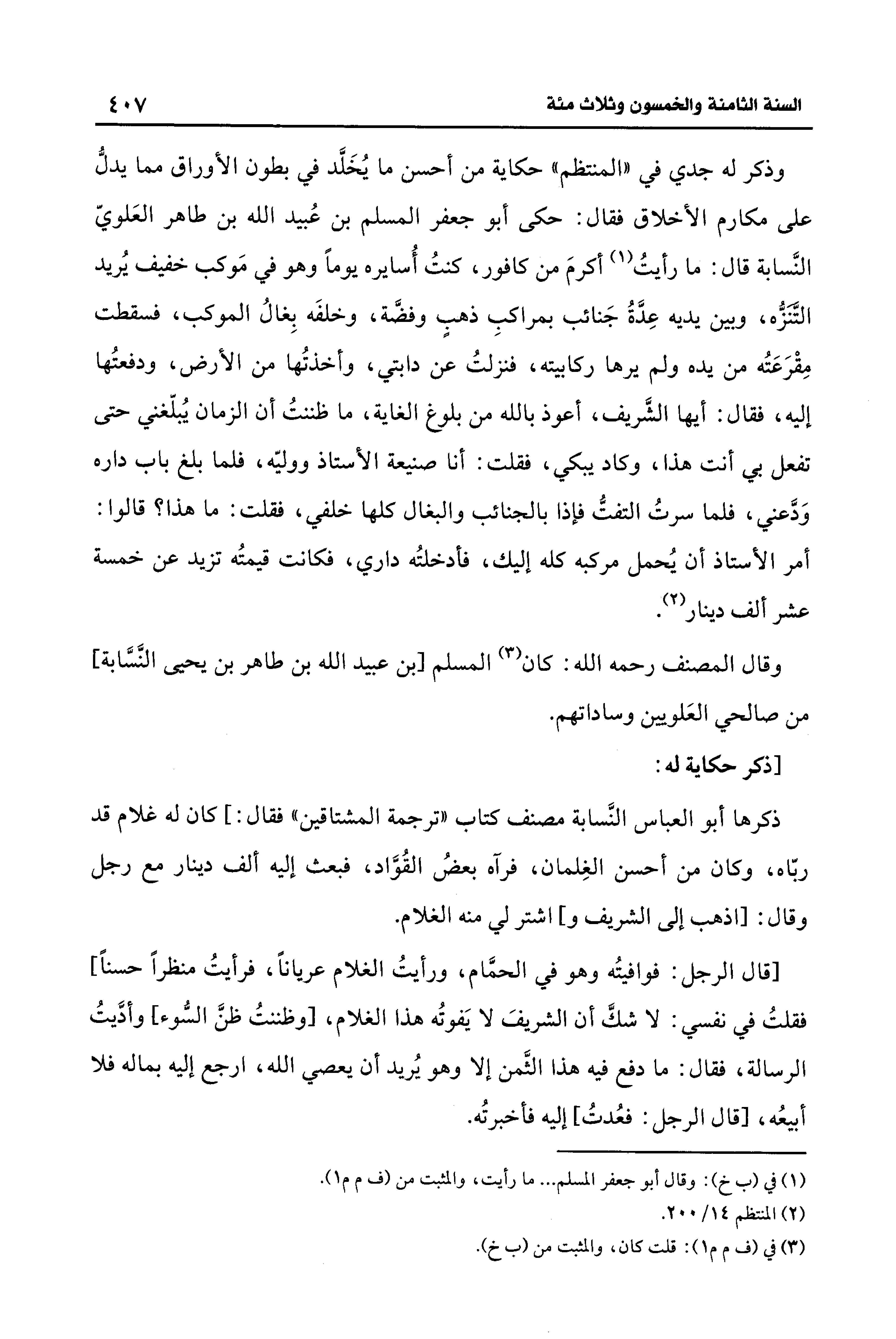 [قال الرجل: فوافيتُه وهو في الحمَّام، ورأيتُ الغلام عريانًا، فرأيتُ منظرًا حسنًا] فقلتُ في نفسي: لا شكَّ أن الشريفَ لا يَفوتُه هذا الغلام، [وظننتُ ظنَّ السُّوء] وأدَّيتُ الرسالة، فقال: ما دفع فيه هذا الثَّمن إلا وهو يُريد أن يعصي الله، ارجع إليه بماله فلا أبيعُه، [قال الرجل: فعُدتُ] إليه فأخبرتُه.