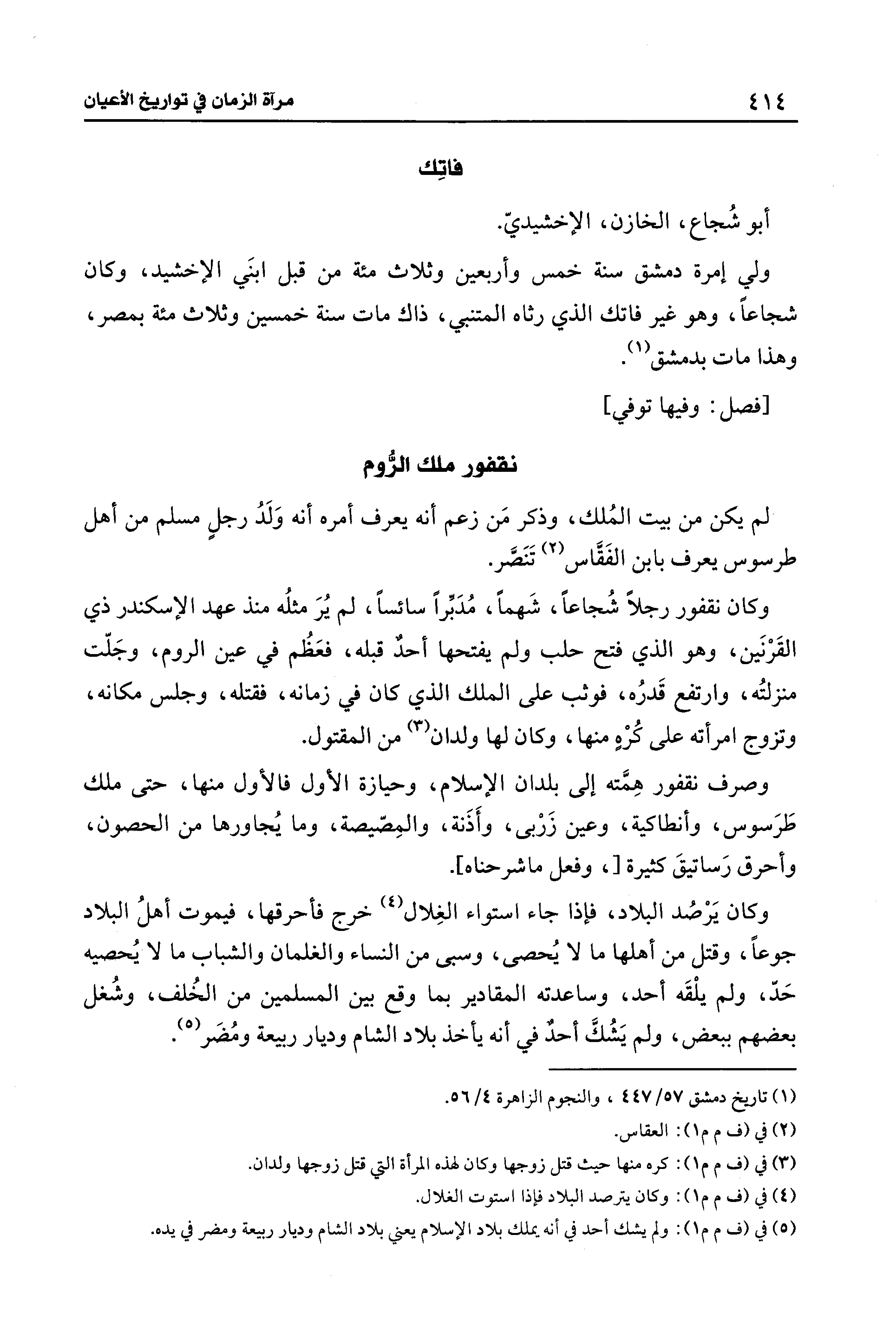 وكان نقفور رجلًا شُجاعًا، شَهمًا، مُدَبِّرًا سائسًا، لم يُرَ مثلُه منذ عهد الإسكندر ذي القَرْنَين، وهو الذي فتح حلب ولم يفتحها أحدٌ قبله، فعَظُم في عين الروم، وجَلّت منزلتُه، وارتفع قَدرُه، فوثب على الملك الذي كان في زمانه، فقتله، وجلس مكانه، وتزوج امرأته على كُرْهٍ منها، وكان لها ولدان (¬3) من المقتول.