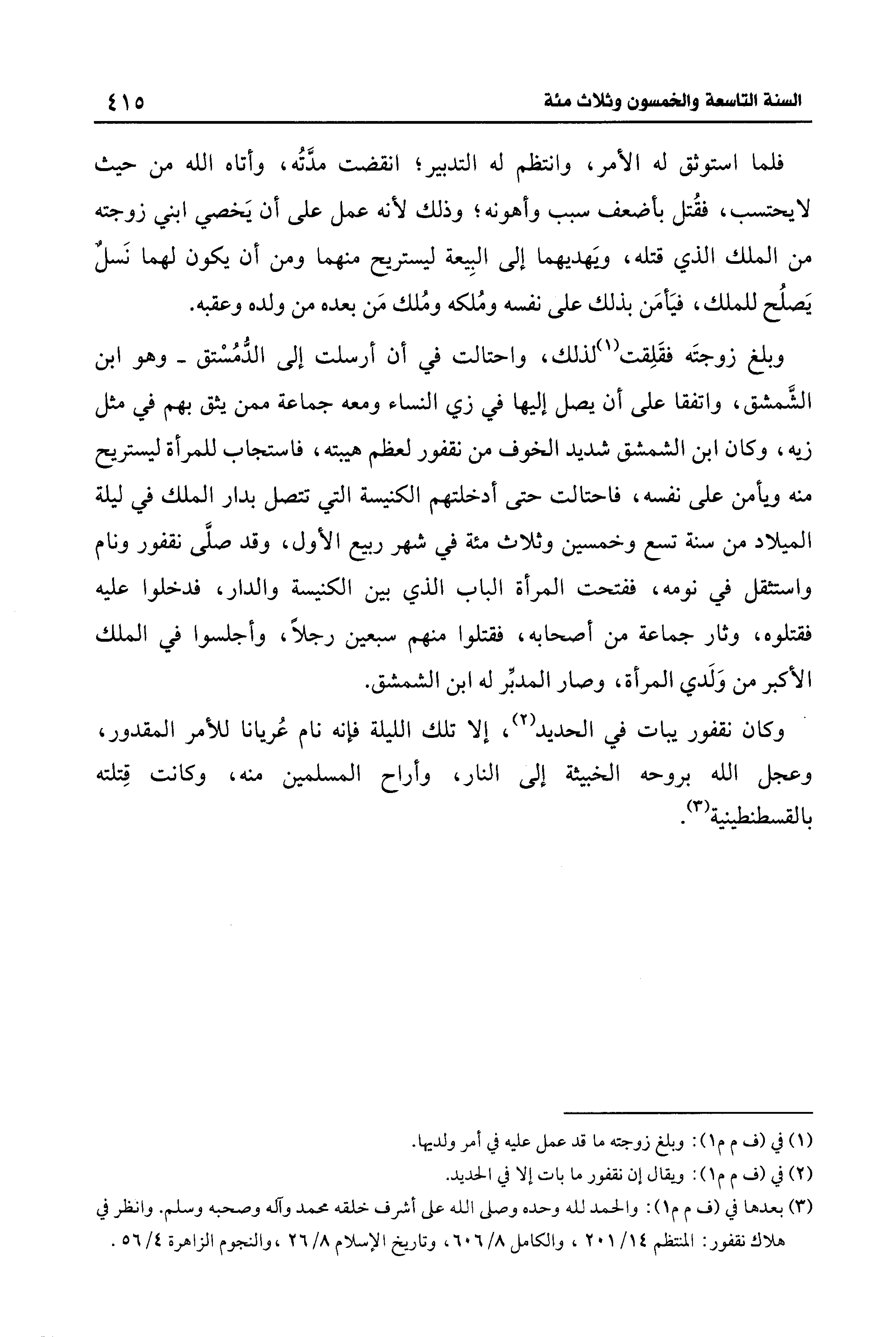 وبلغ زوجتَه فقَلِقت (¬1) لذلك، واحتالت في أن أرسلت إلى الدّمُسْتق -وهو ابن الشَّمشق، واتفقا على أن يصل إليها في زي النساء ومعه جماعة ممن يثق بهم في مثل زيه، وكان ابن الشمشق شديد الخوف من نقفور لعظم هيبته، فاستجاب للمرأة ليستريح منه ويأمن على نفسه، فاحتالت حتى أدخلتهم الكنيسة التي تتصل بدار الملك في ليلة الميلاد من سنة تسع وخمسين وثلاث مئة في شهر ربيع الأول، وقد صلَّى نقفور ونام واستثقل في نومه، ففتحت المرأة الباب الذي بين الكنيسة والدار، فدخلوا عليه فقتلوه، وثار جماعة من أصحابه، فقتلوا منهم سبعين رجلًا، وأجلسوا في الملك الأكبر من وَلَدي المرأة، وصار المدبِّر له ابن الشمشق.