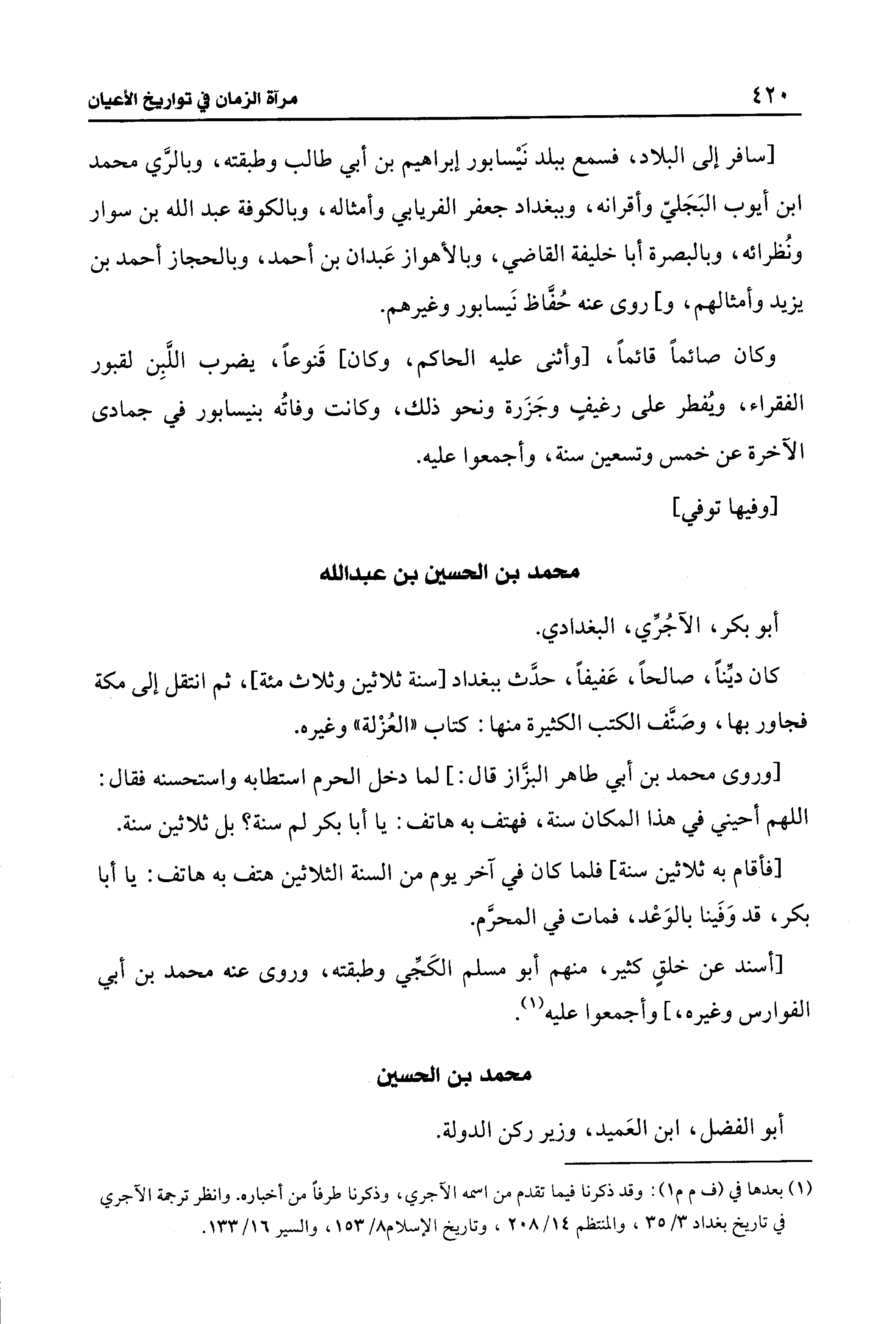 (¬1) بعدها في (ف م م 1): وقد ذكرنا فيما تقدم من اسمه الآجري، وذكرنا طرفًا من أخباره. وانظر ترجمة الآجري في تاريخ بغداد 3/ 35، والمنتظم 14/ 208، وتاريخ الإسلام 8/ 153، والسير 16/ 133.