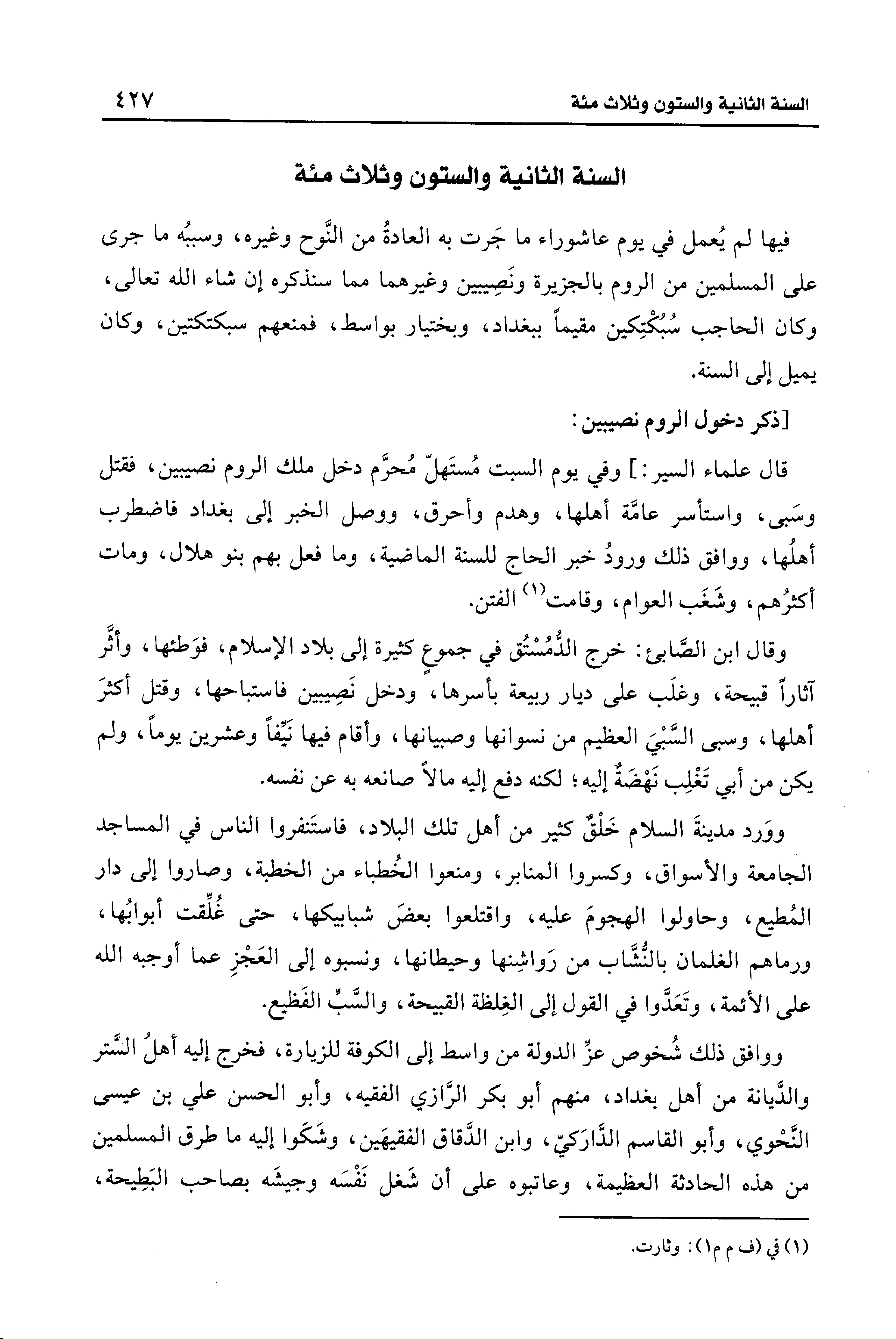 قال علماء السير: ] وفي يوم السبت مُستَهلّ مُحرَّم دخل ملك الروم نصيبين، فقتل وسَبى، واستأسر عامَّة أهلها، وهدم وأحرق، ووصل الخبر إلى بغداد فاضطرب أهلُها، ووافق ذلك ورودُ خبر الحاج للسنة الماضية، وما فعل بهم بنو هلال، ومات أكثرُهم، وشَغَب العوام، وقامت (¬1) الفتن.