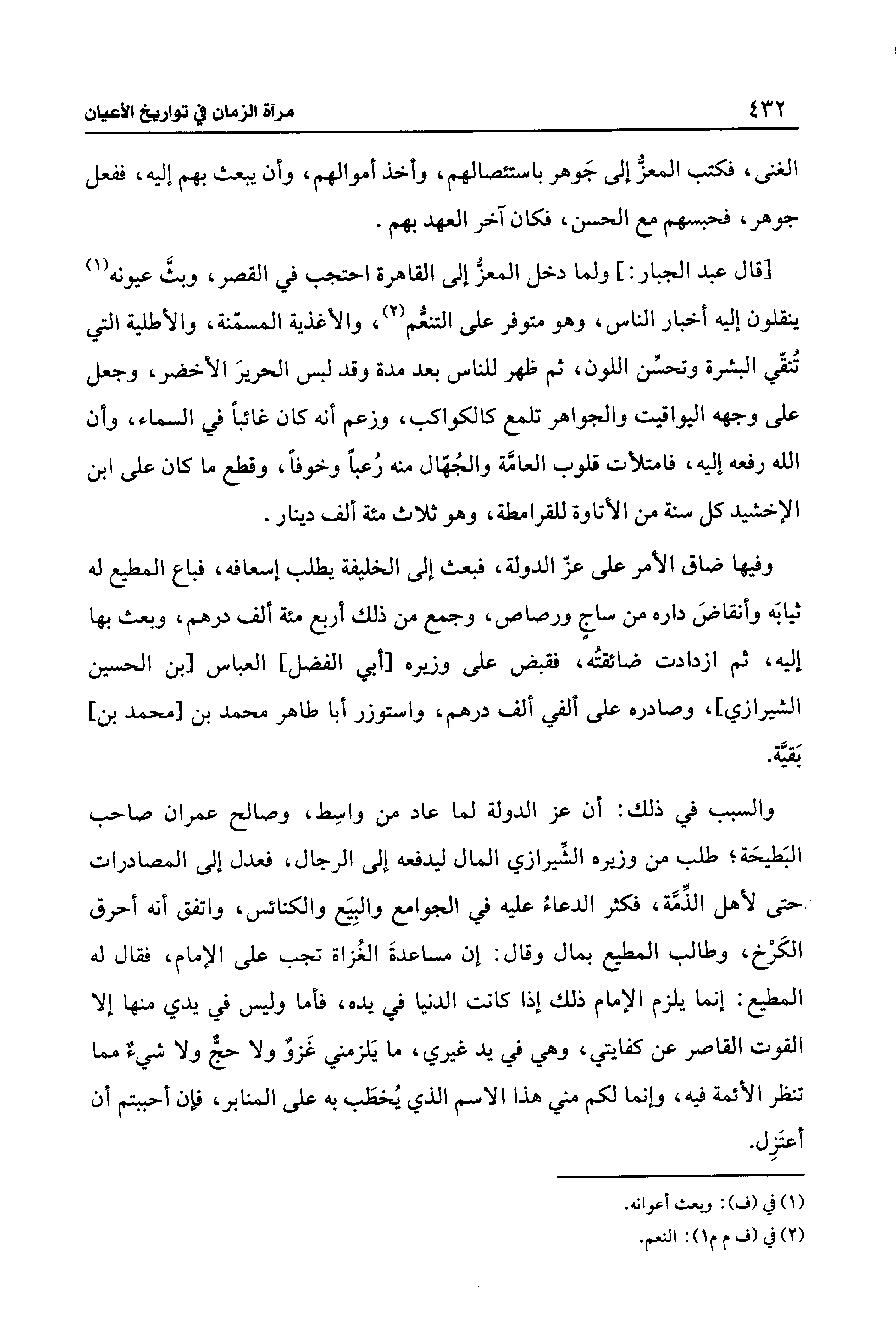 والسبب في ذلك: أن عز الدولة لما عاد من واسِط، وصالح عمران صاحب البَطيحَة؛ طلب من وزيره الشِّيرازي المال ليدفعه إلى الرجال، فعدل إلى المصادرات حتى لأهل الذِّمَّة، فكثر الدعاءُ عليه في الجوامع والبِيَع والكنائس، واتفق أنه أحرق الكَرْخ، وطالب المطيع بمال وقال: إن مساعدةَ الغُزاة تجب على الإمام، فقال له المطيع: إنما يلزم الإمام ذلك إذا كانت الدنيا في يده، فأما وليس في يدي منها إلا القوت القاصر عن كفايتي، وهي في يد غيري، ما يَلزمني غَزوٌ ولا حجٌّ ولا شيءٌ مما تنظر الأئمة فيه، وإنما لكم مني هذا الاسم الذي يُخطَب به على المنابر، فإن أحببتم أن أعتَزِل.
