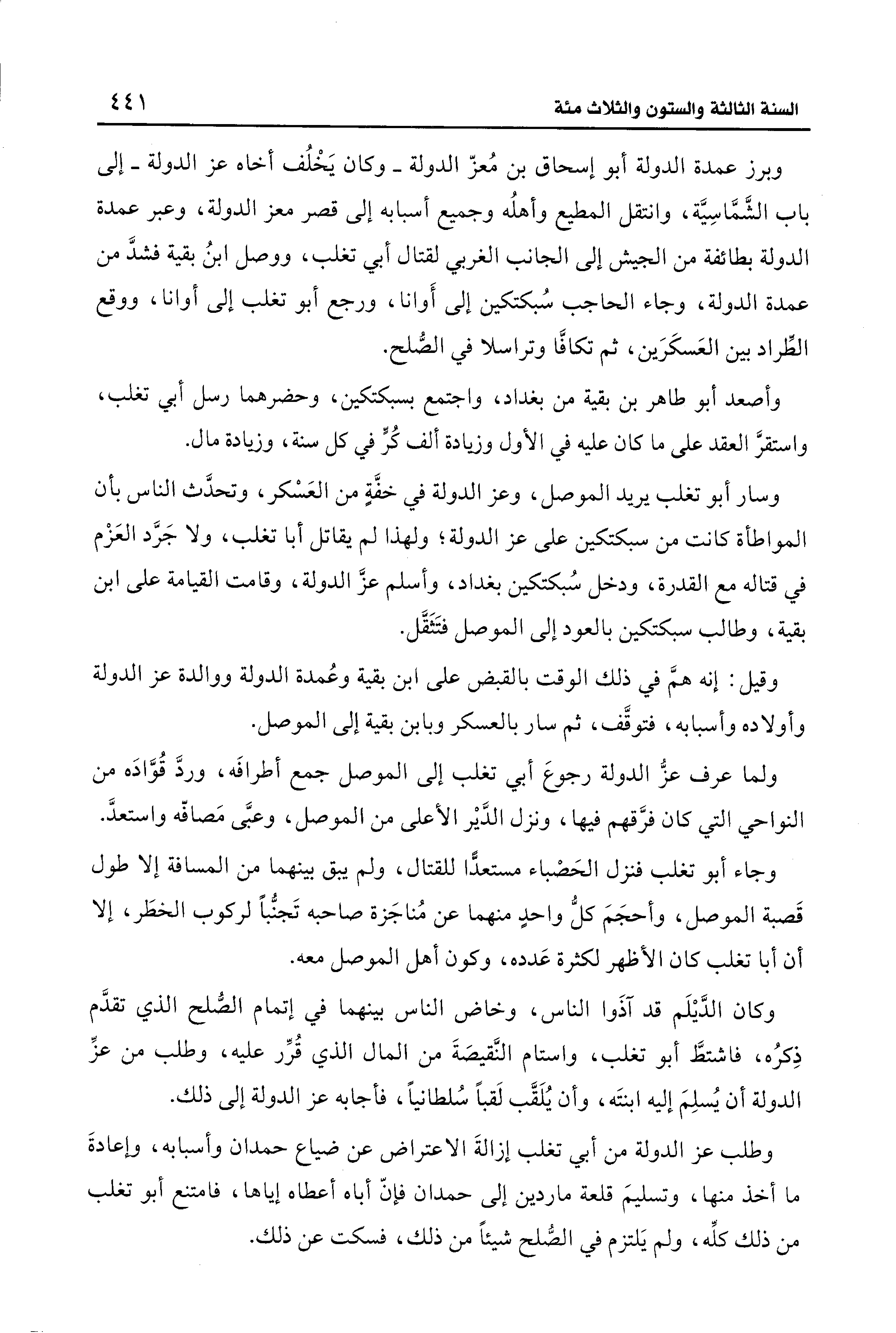 وبرز عمدة الدولة أبو إسحاق بن مُعزّ الدولة -وكان يَخْلُف أخاه عز الدولة- إلى باب الشَّمَّاسِيَّة، وانتقل المطيع وأهلُه وجميع أسبابه إلى قصر معز الدولة، وعبر عمدة الدولة بطائفة من الجيش إلى الجانب الغربي لقتال أبي تغلب، ووصل ابنُ بقية فشدَّ من عمدة الدولة، وجاء الحاجب سُبكتكين إلى أَوانا، ورجع أبو تغلب إلى أوانا، ووقع الطِّراد بين العَسكَرَين، ثم تكافَّا وتراسلا في الصُّلح.