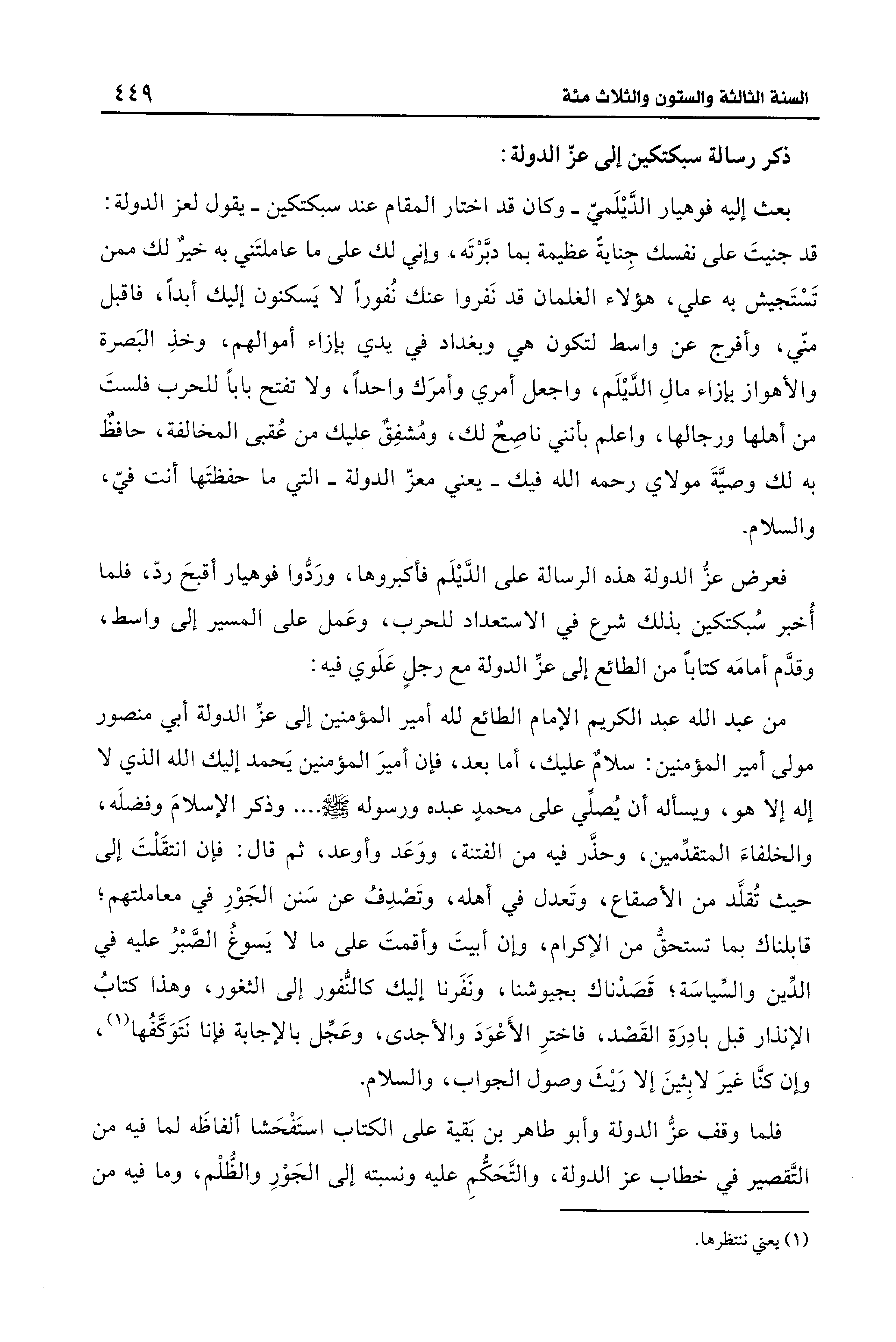 من عبد الله عبد الكريم الإمام الطائع لله أمير المؤمنين إلى عزِّ الدولة أبي منصور مولى أمير المؤمنين: سلامٌ عليك، أما بعد، فإن أميرَ المؤمنين يَحمد إليك الله الذي لا إله إلا هو، ويسأله أن يُصلِّي على محمدٍ عبده ورسوله - صلى الله عليه وسلم -. وذكر الإسلامَ وفضلَه، والخلفاءَ المتقدِّمين، وحذَّر فيه من الفتنة، ووَعَد وأوعد، ثم قال: فإن انتقَلْتَ إلى حيث تُقلَّد من الأصقاع، وتَعدل في أهله، وتَصْدِفُ عن سَنن الجَوْرِ في معاملتهم؛ قابلناك بما تستحقُّ من الإكرام، وإن أبيتَ وأقمتَ على ما لا يَسوغُ الصَّبْرُ عليه في الدِّين والسِّياسَة؛ قَصدْناك بجيوشنا، ونَفَرنا إليك كالنُّفور إلى الثغور، وهذا كتابُ الإنذار قبل بادِرَةِ القَصْد، فاخترِ الأَعْوَدَ والأجدى، وعَجِّل بالإجابة فإنا نتَوَكَّفُها (¬1)، وإن كنَّا غيرَ لابِثينَ إلا رَيثَ وصول الجواب، والسلام.