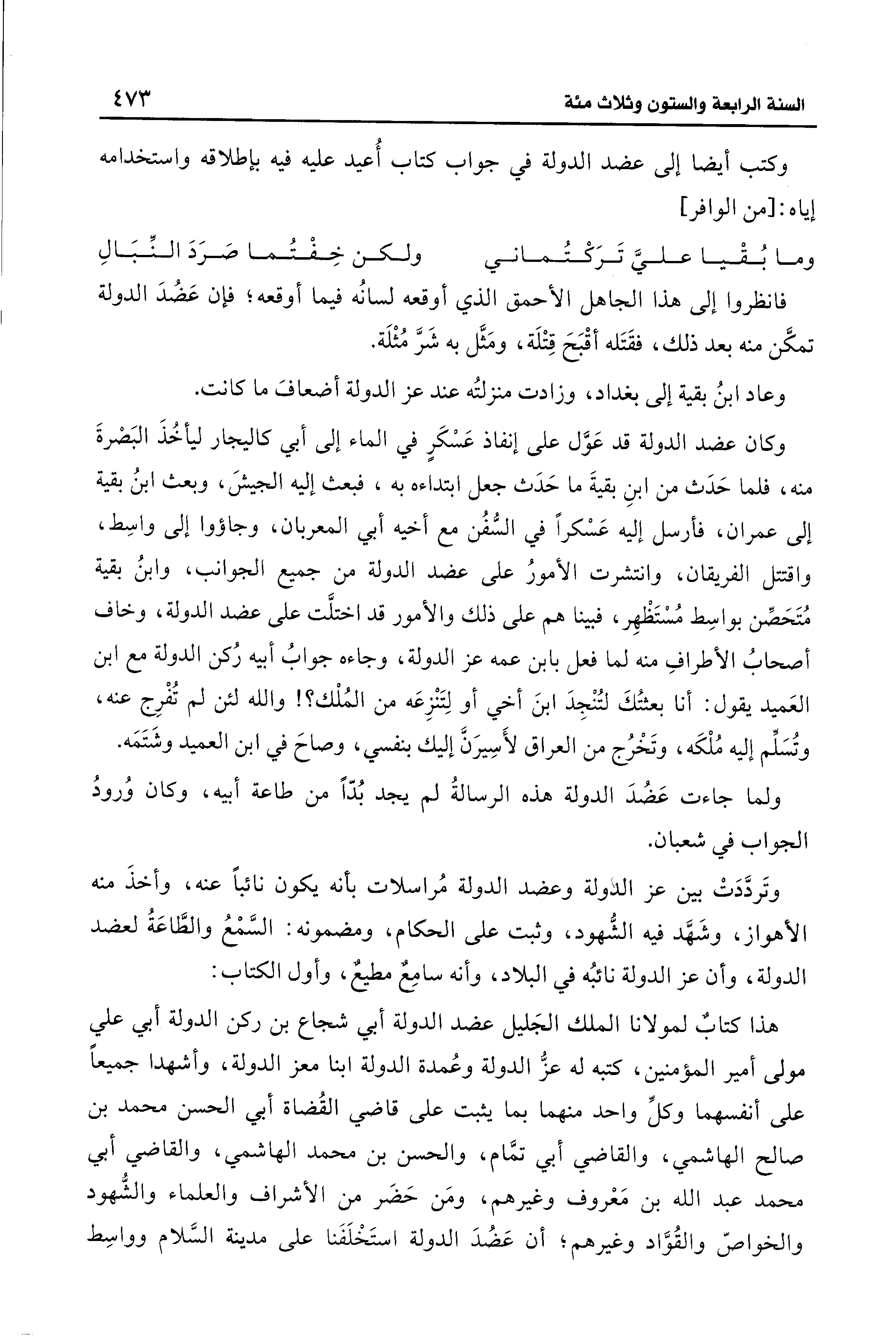 هذا كتابٌ لمولانا الملك الجَليل عضد الدولة أبي شجاع بن ركن الدولة أبي علي مولى أمير المؤمنين، كتبه له عزُّ الدولة وعُمدة الدولة ابنا معز الدولة، وأشهدا جميعًا على أنفسهما وكلِّ واحد منهما بما يثبت على قاضي القُضاة أبي الحسن محمد بن صالح الهاشمي، والقاضي أبي تمَّام، والحسن بن محمد الهاشمي، والقاضي أبي محمد عبد الله بن مَعْروف وغيرهم، ومَن حَضَر من الأشراف والعلماء والشُّهود والخواصّ والقُوَّاد وغيرهم؛ أن عَضُدَ الدولة استَخْلَفَنا على مدينة السَّلام وواسِط