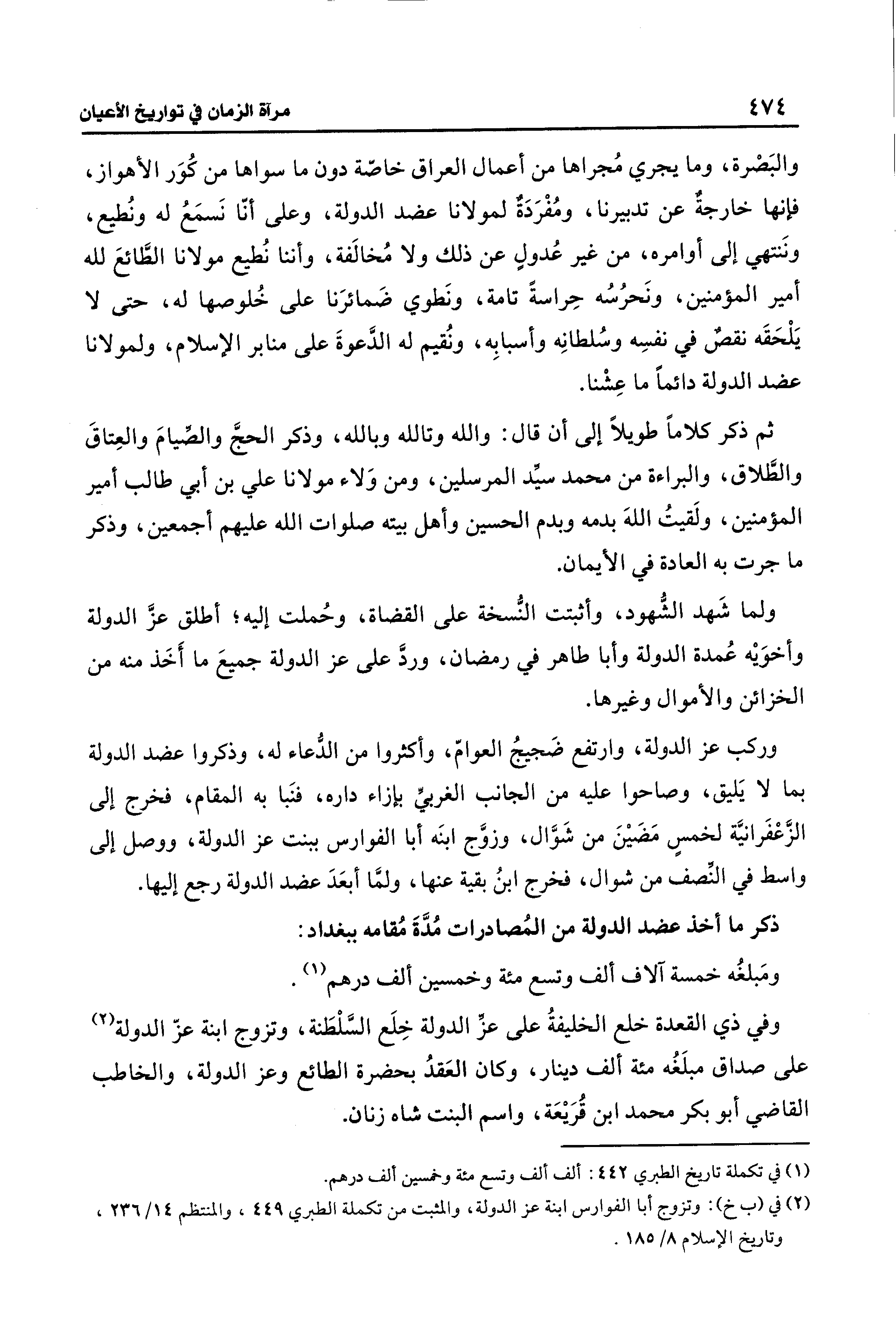 والبَصْرة، وما يجري مُجراها من أعمال العراق خاصّة دون ما سواها من كُوَر الأهواز، فإنها خارجةٌ عن تدبيرنا، ومُفْرَدَةٌ لمولانا عضد الدولة، وعلى أنّا نَسمَعُ له ونُطيع، ونَنتهي إلى أوامره، من غير عُدولٍ عن ذلك ولا مُخالفة، وأننا نُطيع مولانا الطَّائعَ لله أمير المؤمنين، ونَحرُسُه حِراسةً تامة، ونَطوي ضَمائرَنا على خُلوصها له، حتى لا يَلْحَقَه نقصٌ في نفسِه وسُلطانِه وأسبابِه، ونُقيم له الدَّعوةَ على منابر الإسلام، ولمولانا عضد الدولة دائمًا ما عِشْنا.