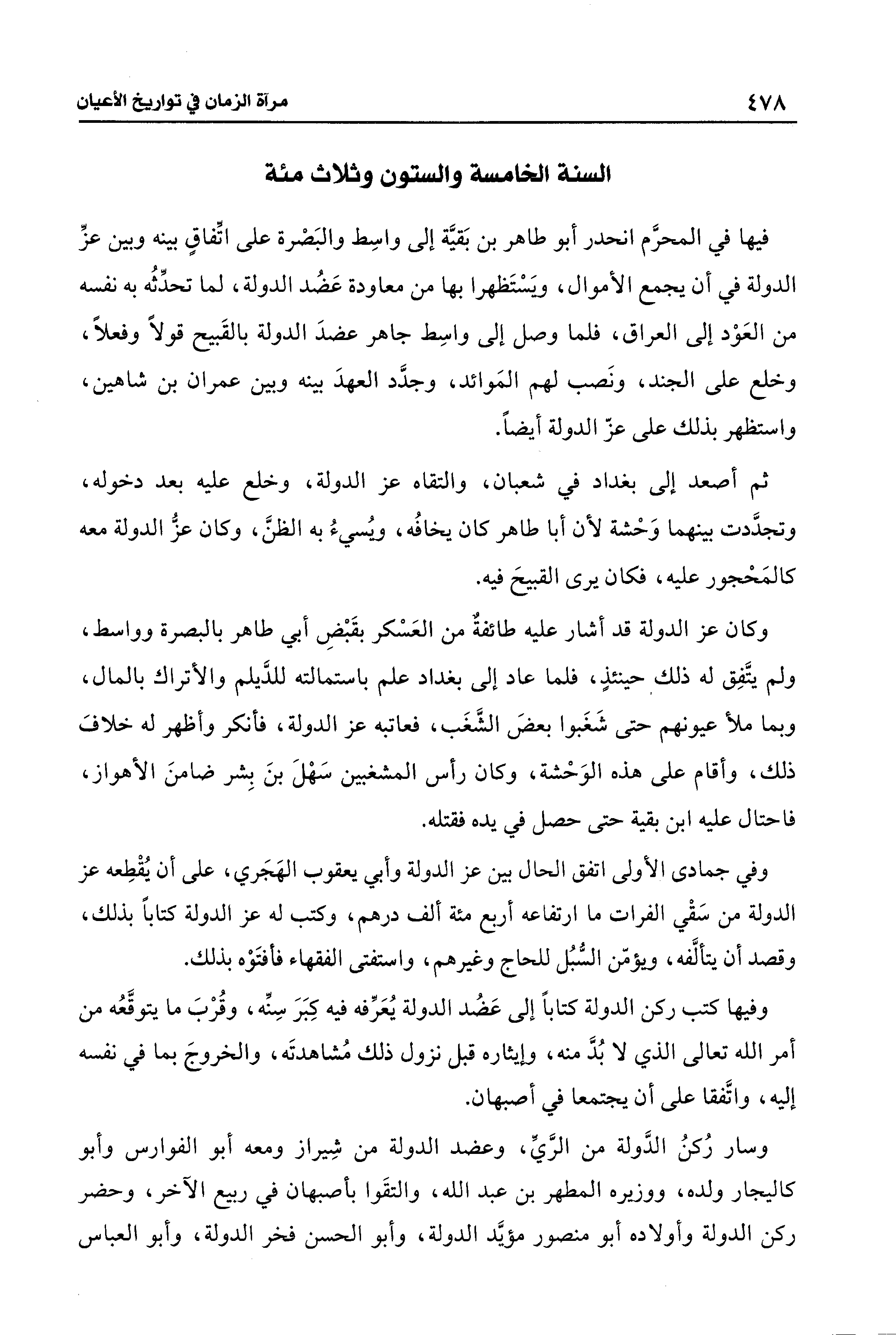 فيها في المحرَّم انحدر أبو طاهر بن بَقيَّة إلى واسِط والبَصْرة على اتِّفاقٍ بينه وبين عزِّ الدولة في أن يجمع الأموال، ويَسْتَظهرا بها من معاودة عَضُد الدولة، لما تحدِّثُه به نفسه من العَوْد إلى العراق، فلما وصل إلى واسِط جاهر عضدَ الدولة بالقَبيح قولًا وفعلًا، وخلع على الجند، ونَصب لهم المَوائد، وجدَّد العهدَ بينه وبين عمران بن شاهين، واستظهر بذلك على عزّ الدولة أيضًا.