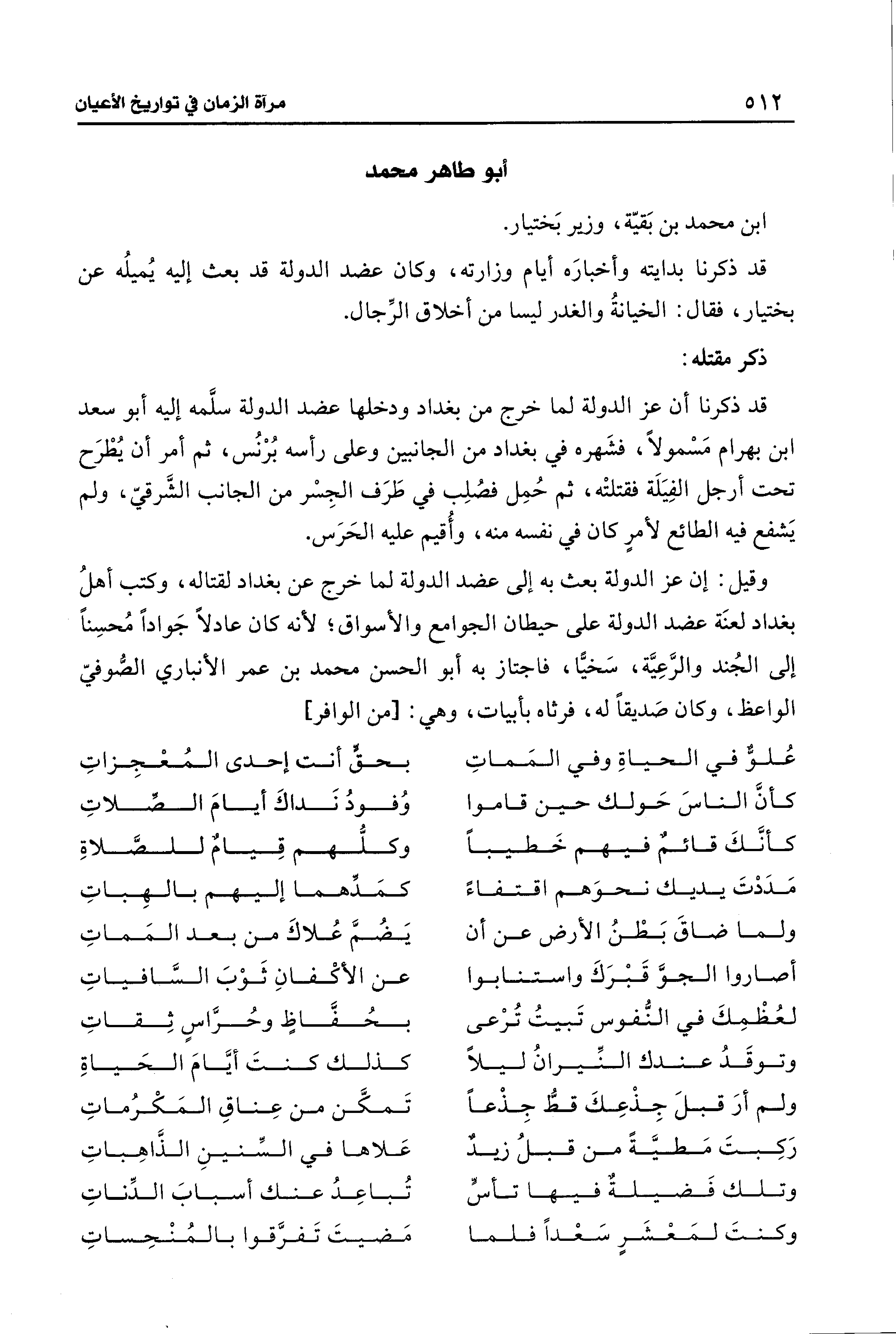وقيل: إن عز الدولة بعث به إلى عضد الدولة لما خرج عن بغداد لقتاله، وكتب أهلُ بغداد لعنَة عضد الدولة على حيطان الجوامع والأسواق؛ لأنه كان عادلًا جَوادًا مُحسِنًا إلى الجُند والرَّعِيَّة، سَخيًّا، فاجتاز به أبو الحسن محمَّد بن عمر الأنباري الصُّوفيّ الواعظ، وكان صَديقًا له، فرثاه بأبيات، وهي: [من الوافر]