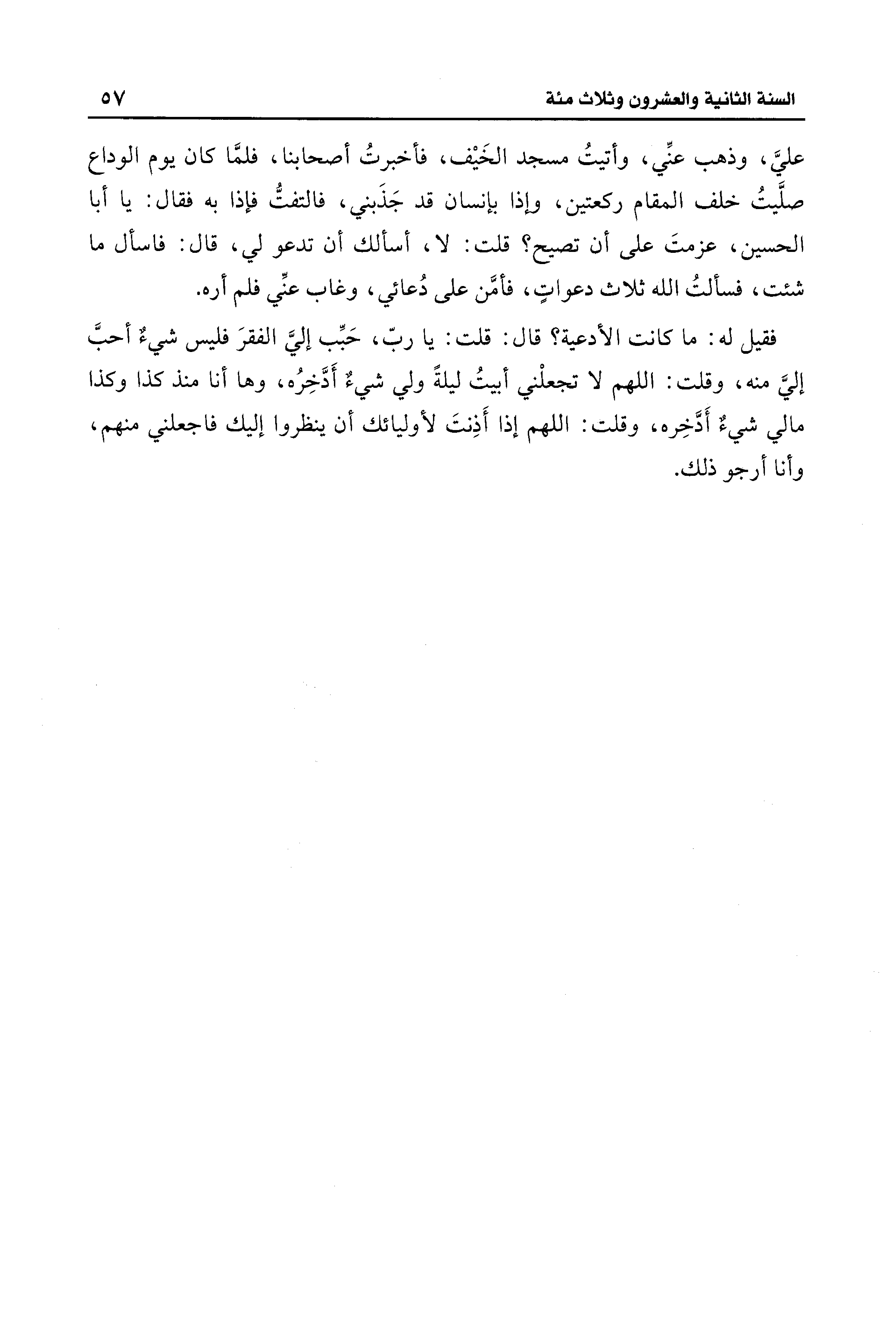 عليَّ، وذهب عنِّي، وأتيتُ مسجد الخَيف، فأخبرتُ أصحابنا، فلمَّا كان يوم الوداع صلَّيتُ خلف المقام ركعتين، وإذا بإنسان قد جَذَبني، فالتفتُّ فإذا به فقال: يا أبا الحسين، عزمتَ على أن تصيح؟ قلت: لا، أسألك أن تدعو لي، قال: فأسأل ما شئت، فسألتُ الله ثلاث دعواتٍ، فأمَّن على دُعائي، وغاب عنِّي فلم أره.