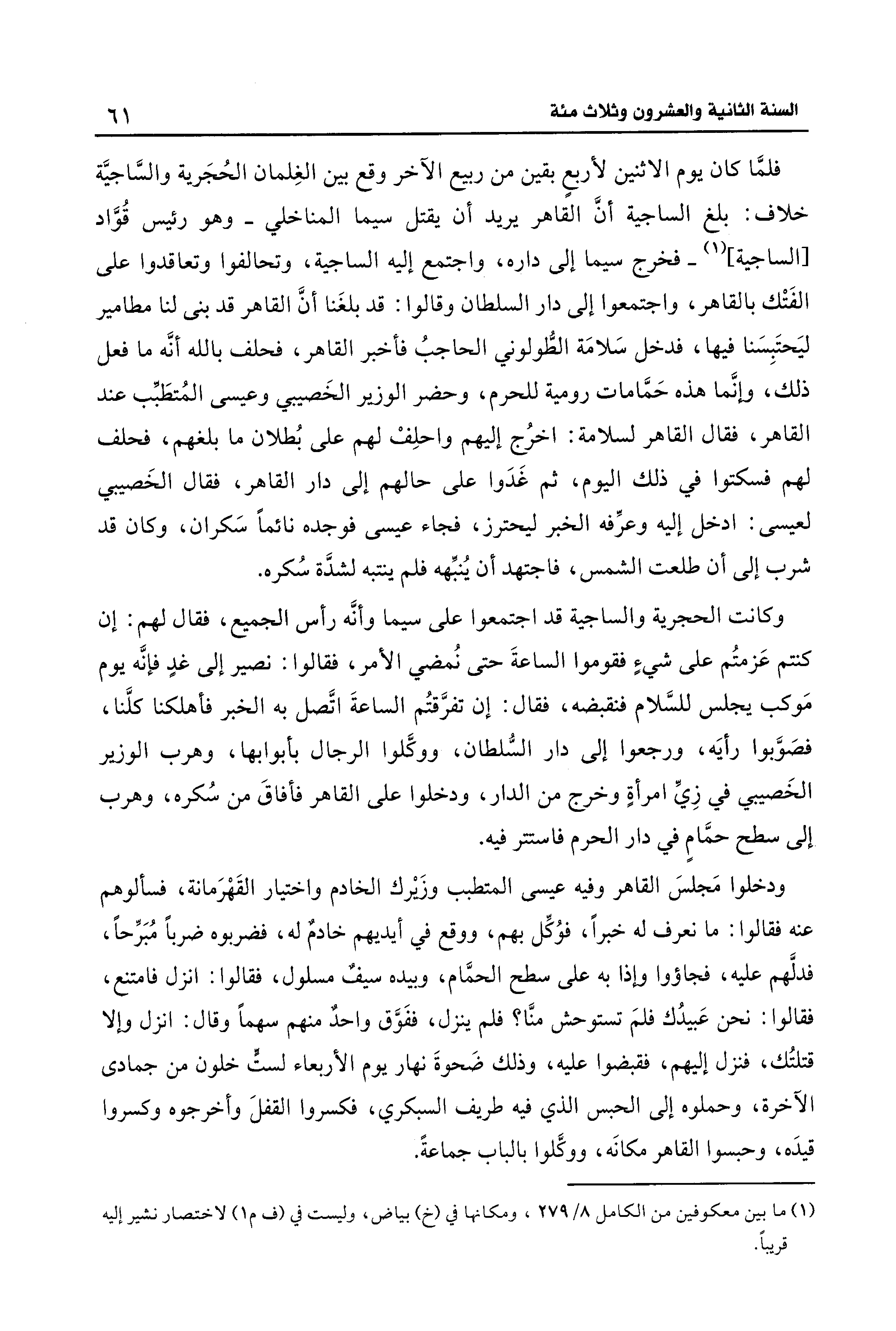 وكانت الحجرية والساجية قد اجتمعوا على سيما وأنَّه رأس الجميع، فقال لهم: إن كنتم عَزمتُم على شيءٍ فقوموا الساعةَ حتى نُمضي الأمر، فقالوا: نصير إلى غدٍ فإنَّه يوم مَوكب يجلس للسَّلام فنقبضه، فقال: إن تفرَّقتُم الساعةَ اتَّصل به الخبر فأهلكنا كلَّنا، فصَوَّبوا رأيَه، ورجعوا إلى دار السُّلطان، ووكَّلوا الرجال بأبوابها، وهرب الوزير الخَصيبي في زِيِّ امرأةٍ وخرج من الدار، ودخلوا على القاهر فأفاقَ من سُكره، وهرب إلى سطح حمَّامٍ في دار الحرم فاستتر فيه.